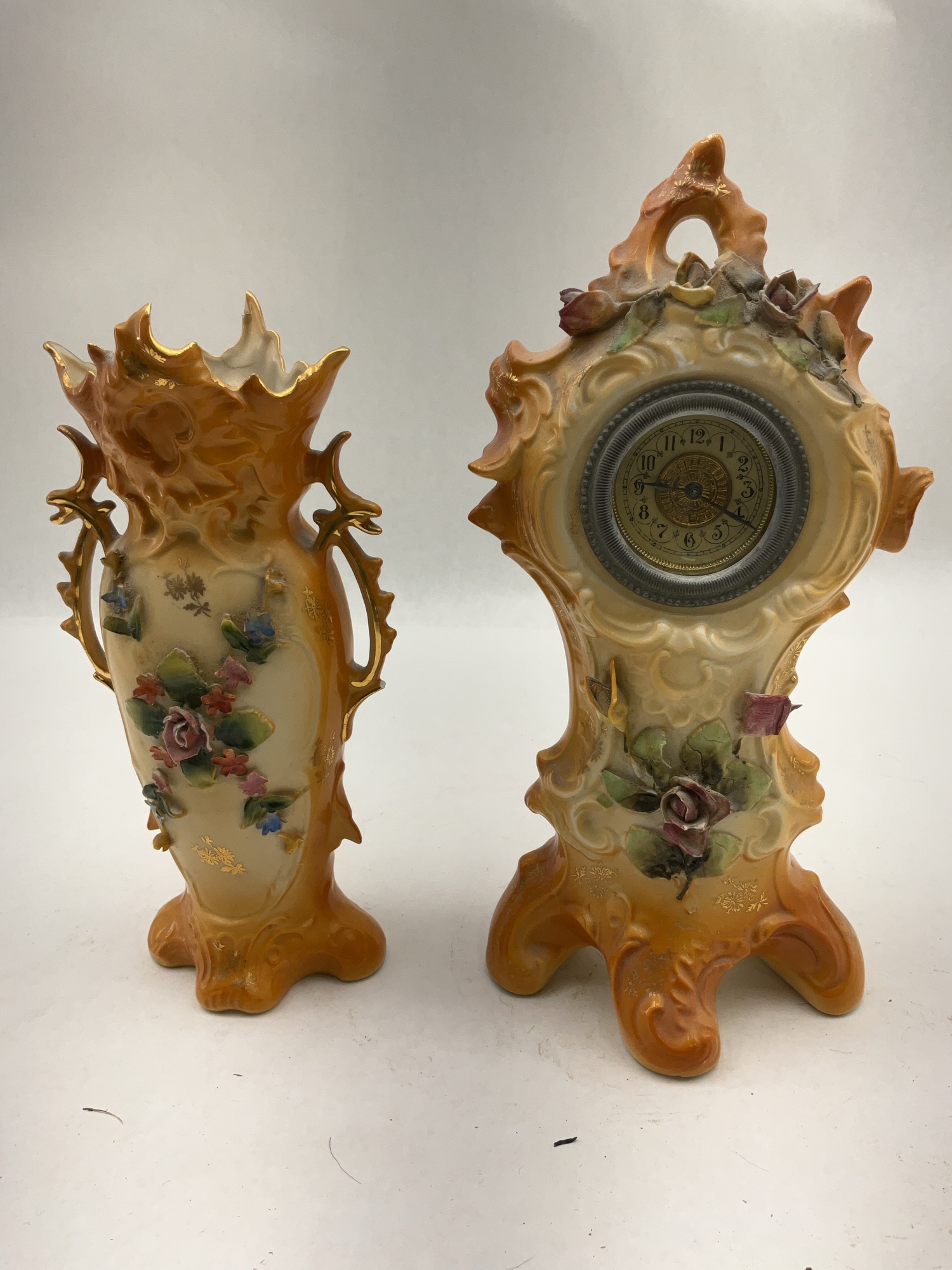 Matching clock and vase with floral decorations. Clock measures 11” tall and 6” wide. Vase is 10” tall and 5 wide.