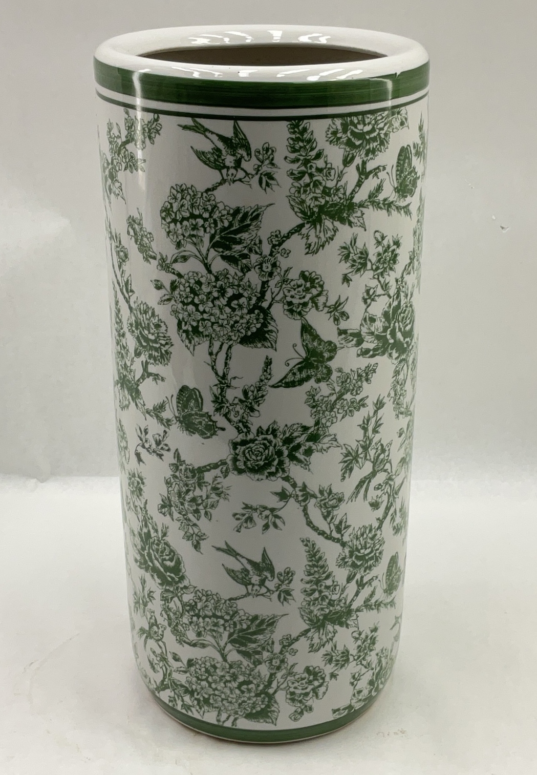 White ceramic umbrella stand featuring a green floral pattern. Measures approximately 18 inches tall and 9 inches across.