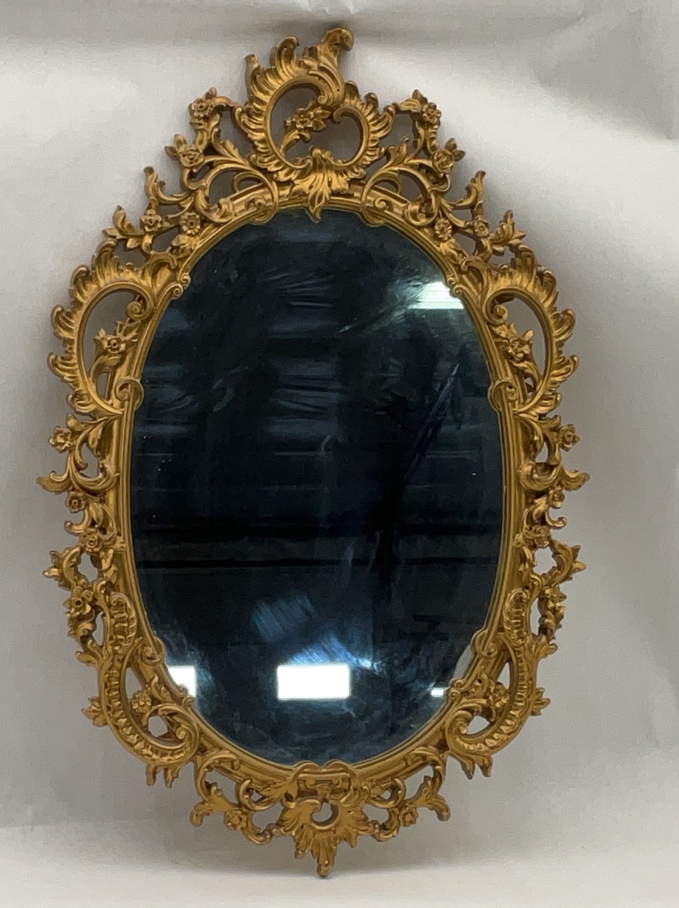 Rococo Wood Gold Tone Oval Wall Mirror by Syracuse Ornamental Co. Inc. Copyrighted. Measures 30x18.