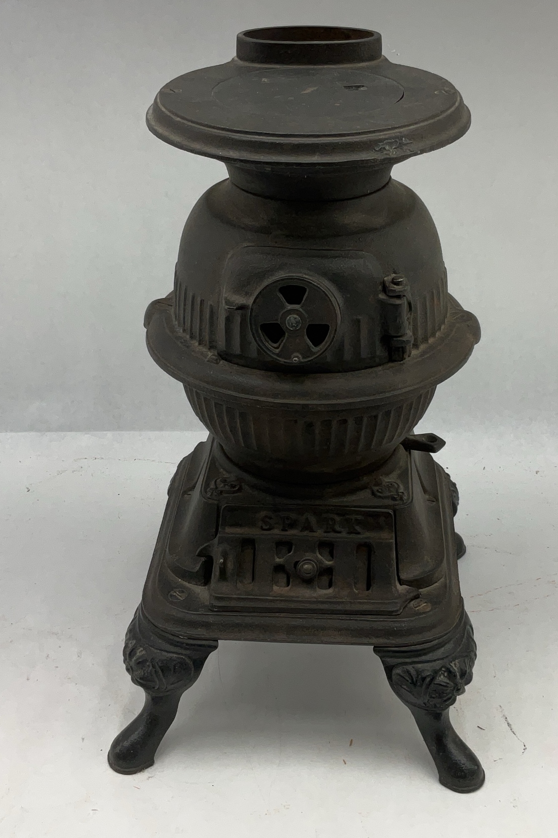 Cast iron toy stove manufactured by Starr Mfg Co. Includes poker. Measures approximately 8x8x14.