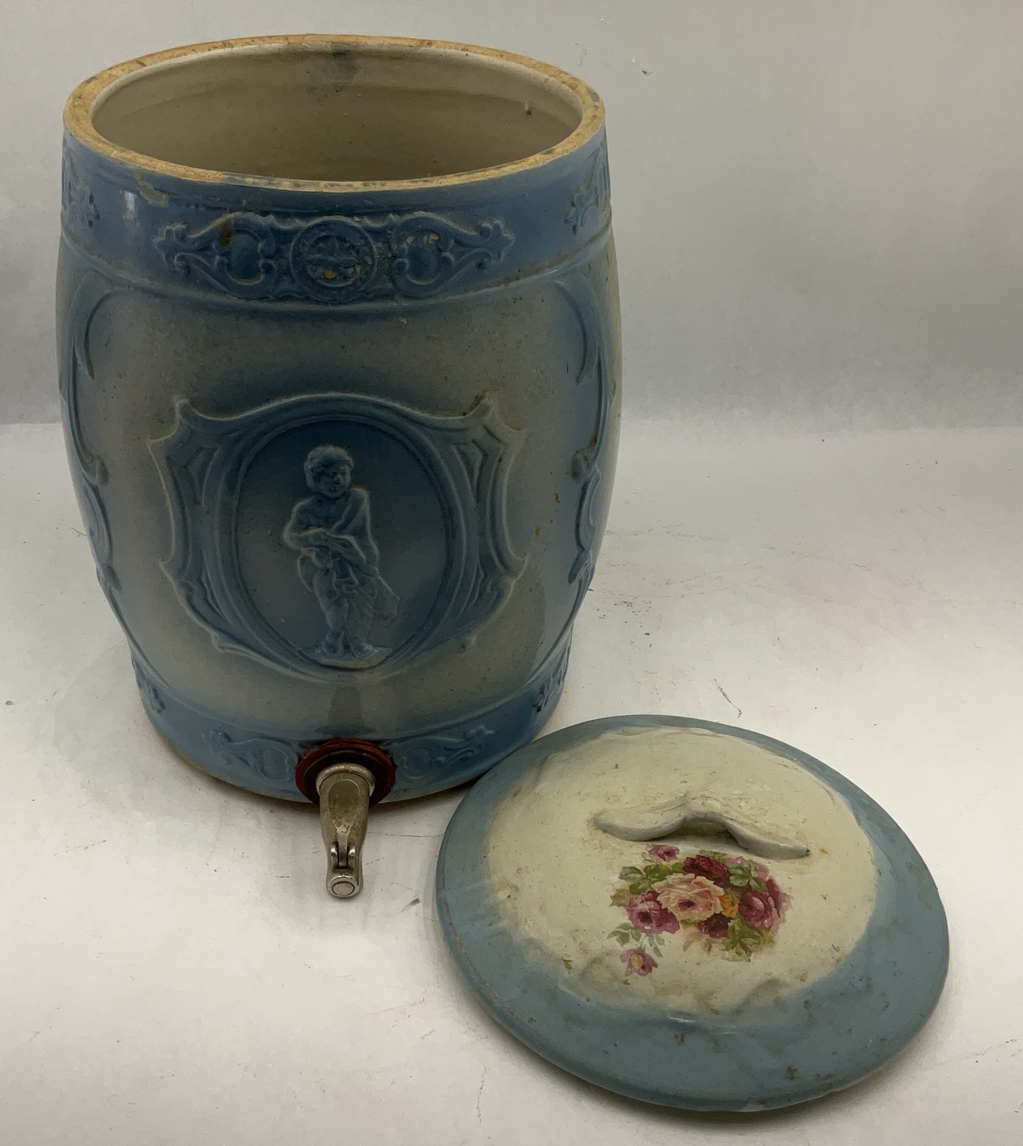 Stoneware water cooler featuring decorative embellishments and a spigot. Dimensions: Approximately 15 inches in height and 10 inches across. Includes a lid that is believed to be a replacement.