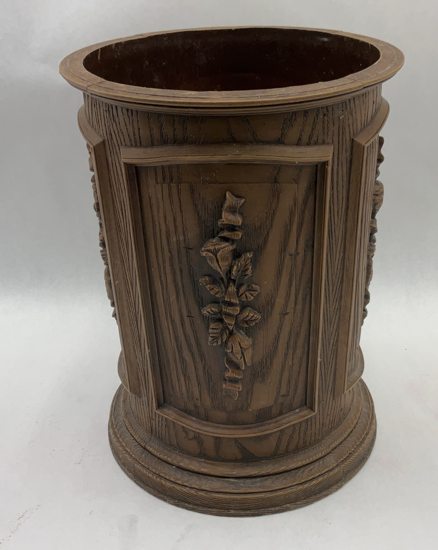 Brown wooden style waste basket, measuring approximately 11 inches across and 15 inches tall.