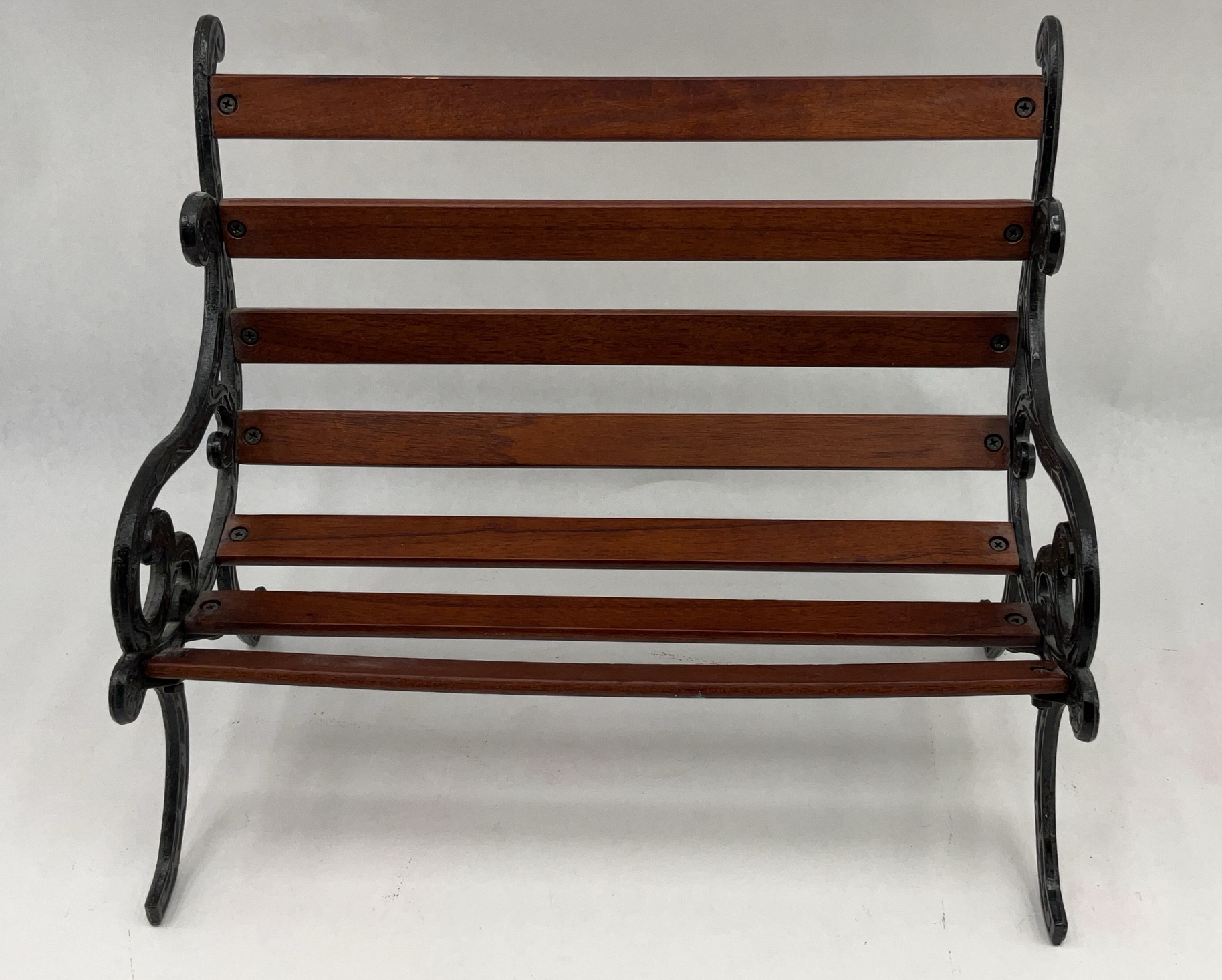 A decorative miniature park bench featuring a black metal frame and wooden slats for the seat and back. The bench measures approximately 15x8x12.