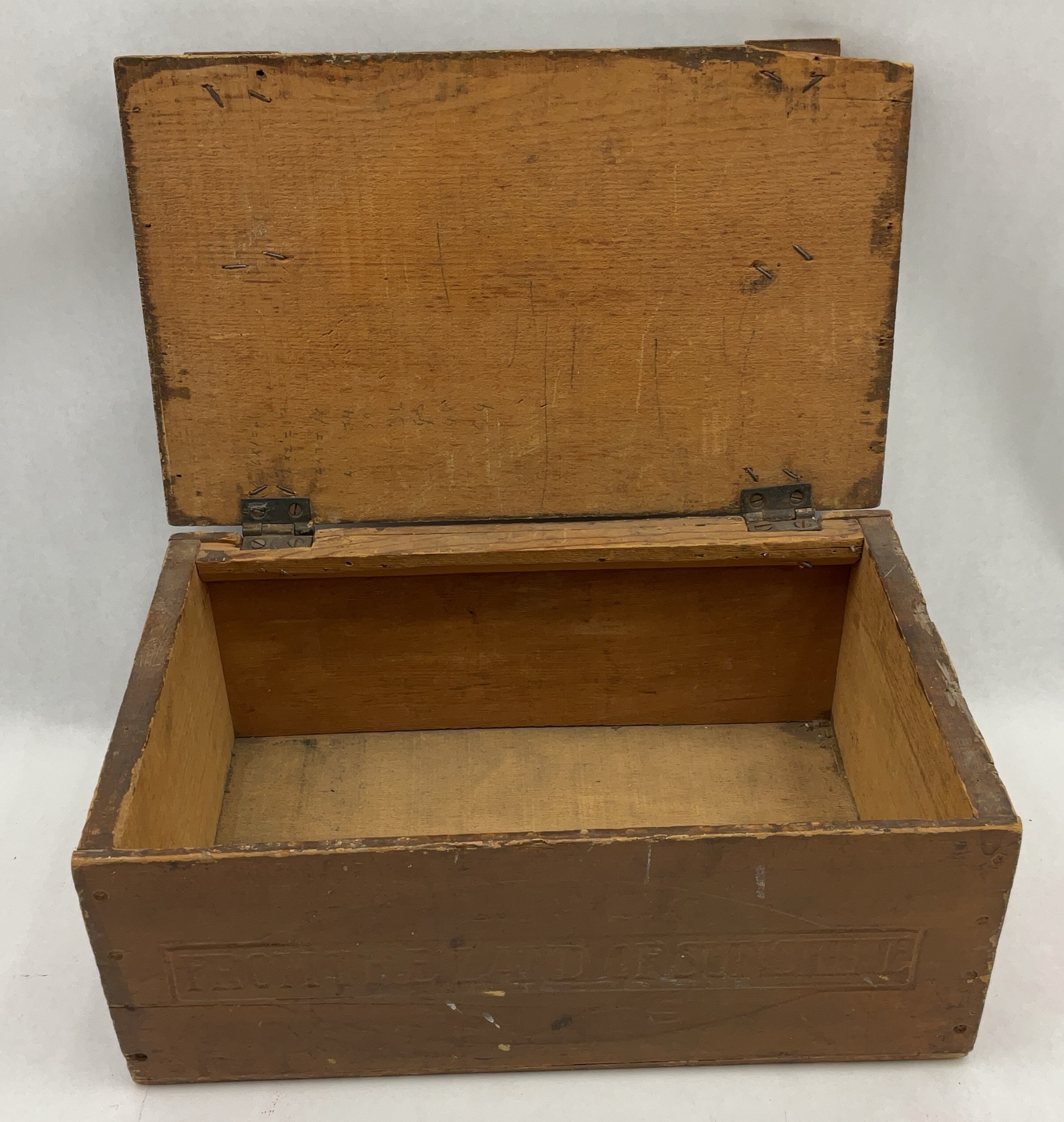Wooden crate with hinged lid, featuring embossed branding for 'California Prunes 25 LBS. NET'. Additional text includes 'From Nature's Gift of Sunshine' and '40-50 Exclusive'. Measures approximately 16x10x7.