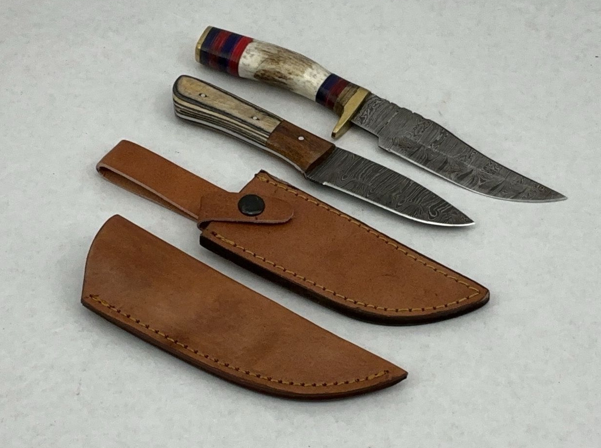 This listing features a set of two Damascus steel hunting knives. The larger knife measures approximately 10" x 2", while the smaller knife measures 8" x 1". Both knives have custom wood handles and come with leather sheaths.