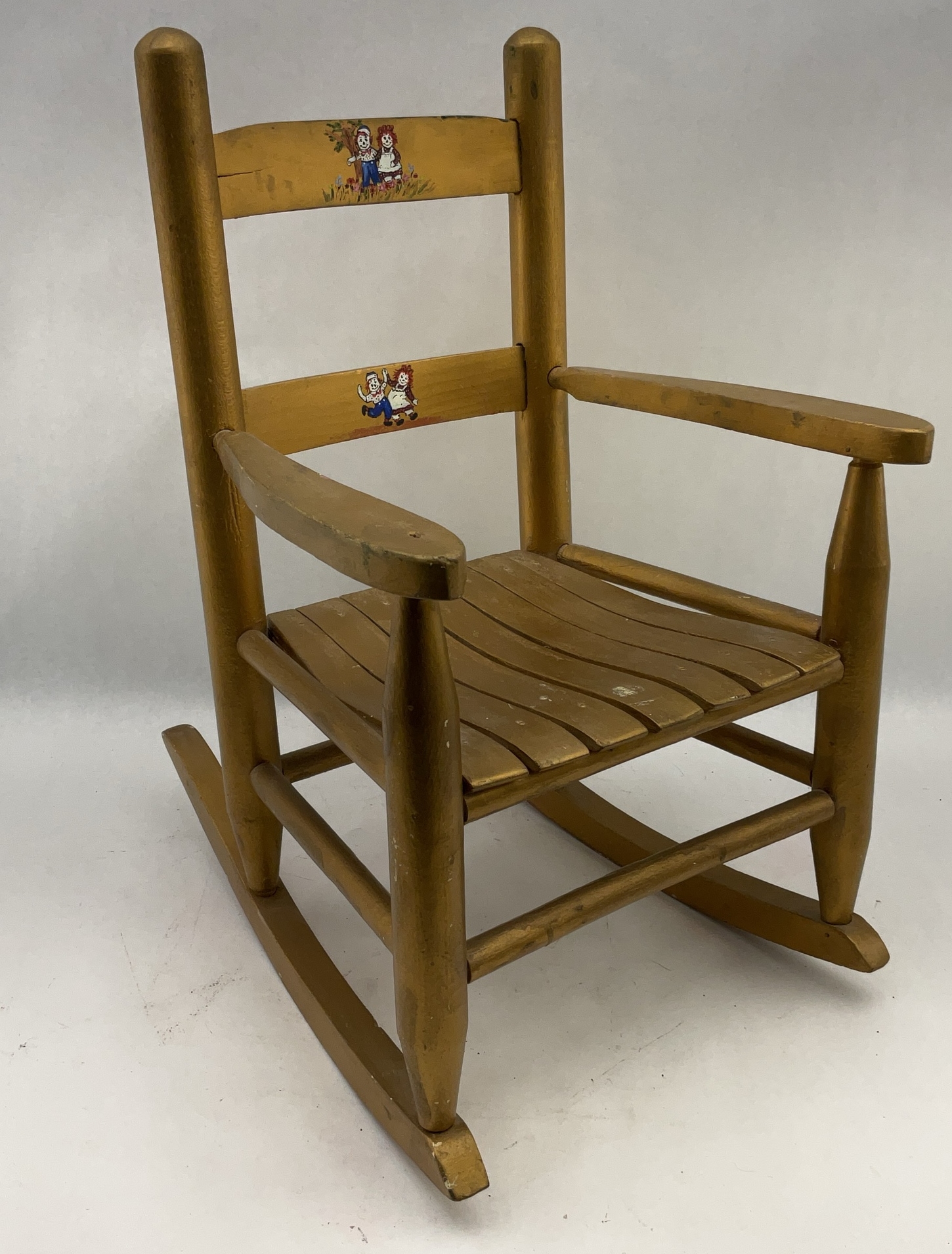 Children's rocking chair featuring a painted golden finish and Raggedy Ann and Andy illustrations. Dimensions are 20x15x25.
