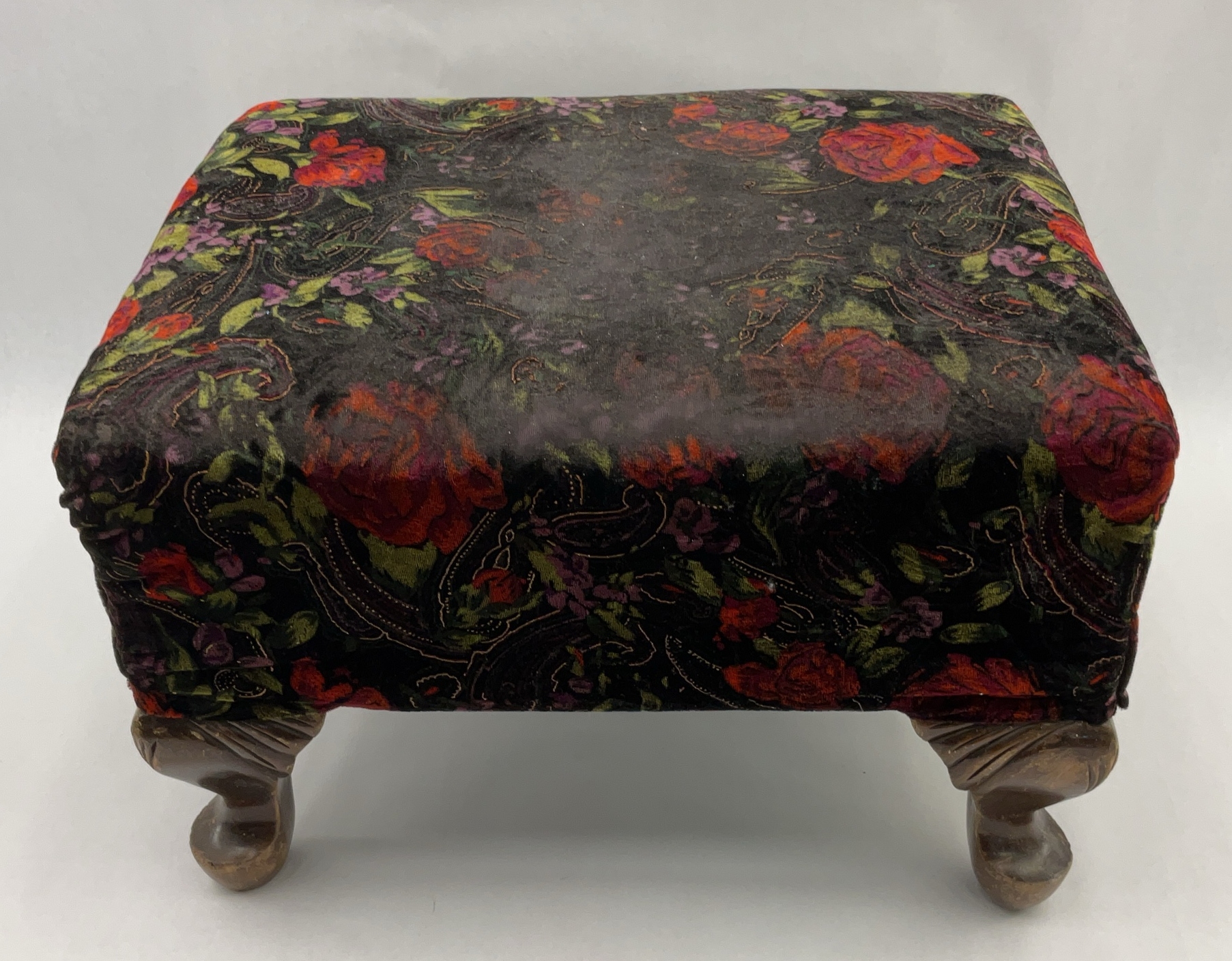 Floral Velvet Upholstered Footstool with Carved Legs