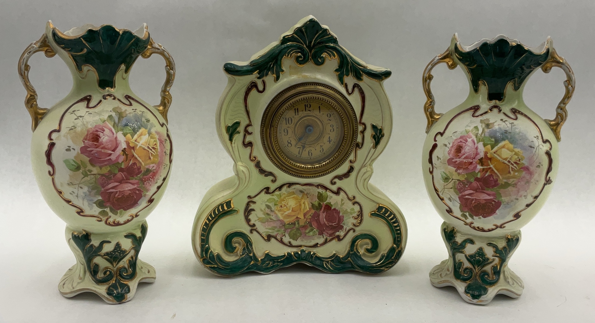 Decorative clock and matching vases. The clock has floral detail on the front. The vases are also decorated with floral details and are 10x6. The clock is 10x3x11