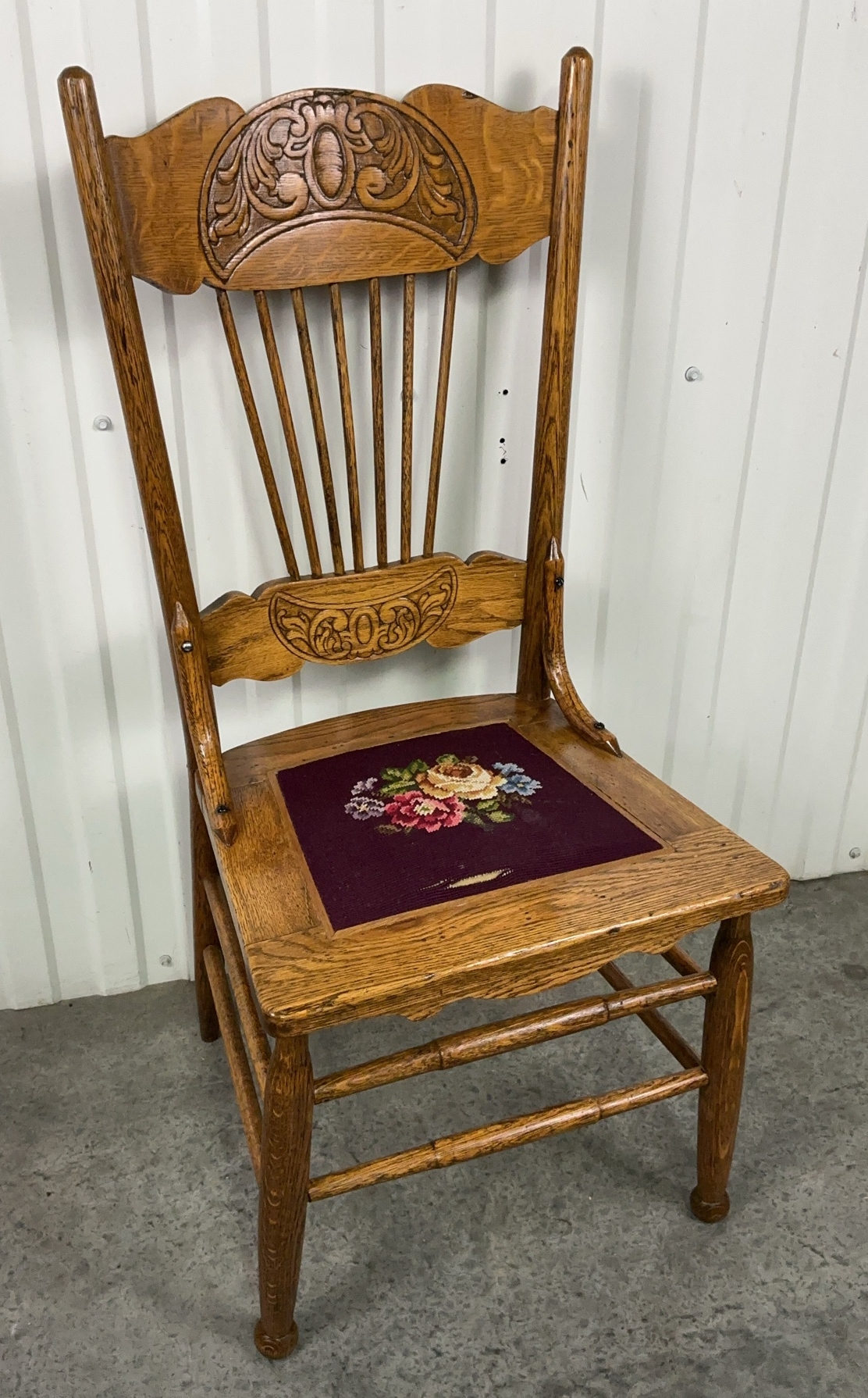 Antique Pressed Back Oak Side Chair with Original Needlepoint Seat