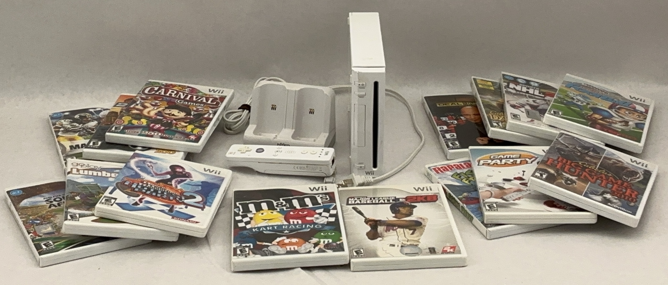Nintendo Wii console bundled with a selection of games, charging dock, and one controller. Used. Missing power cord and additional game controller. Untested.