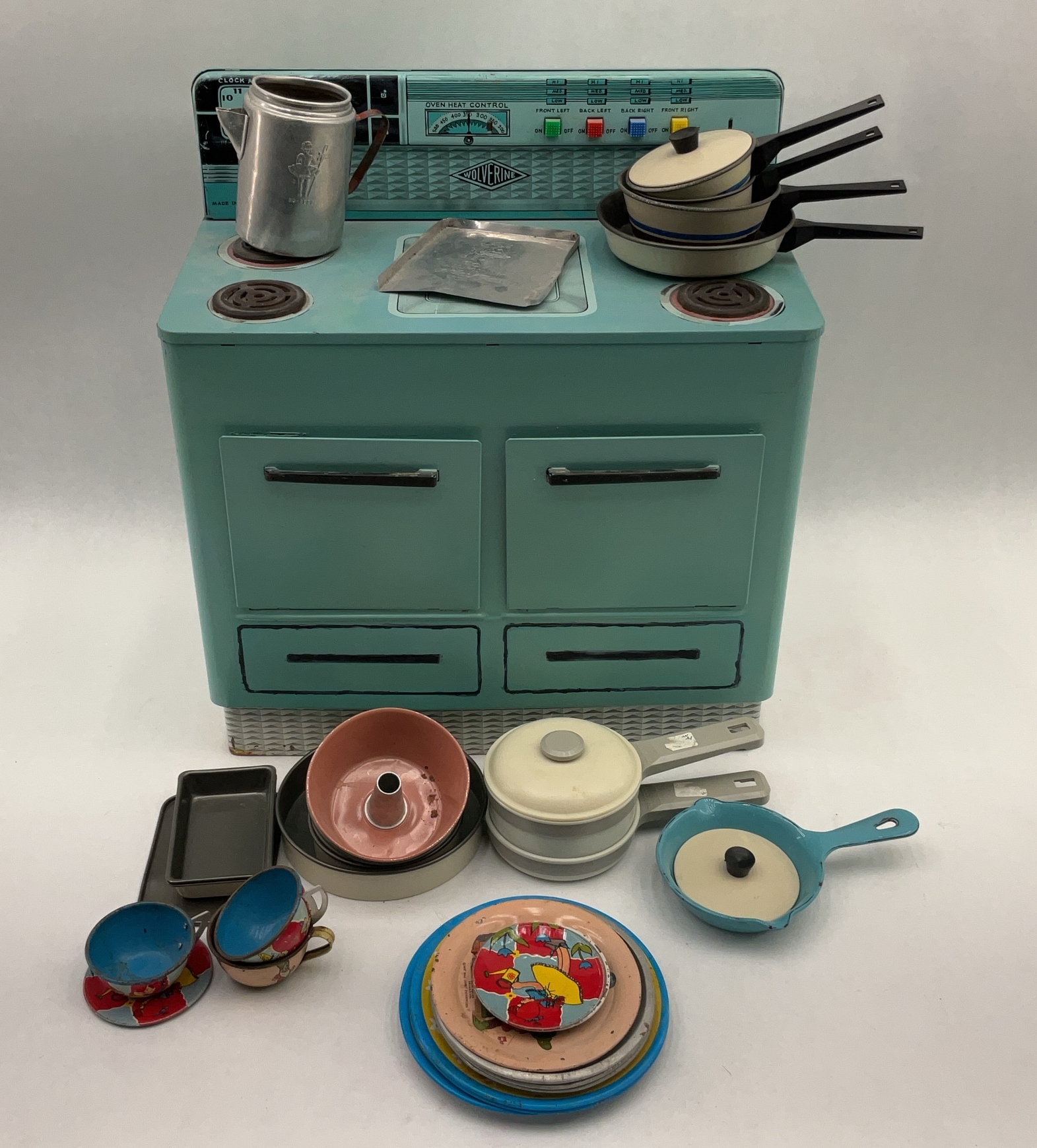 Wolverine brand toy stove with assorted metal cookware. The stove measures 14x7x12.