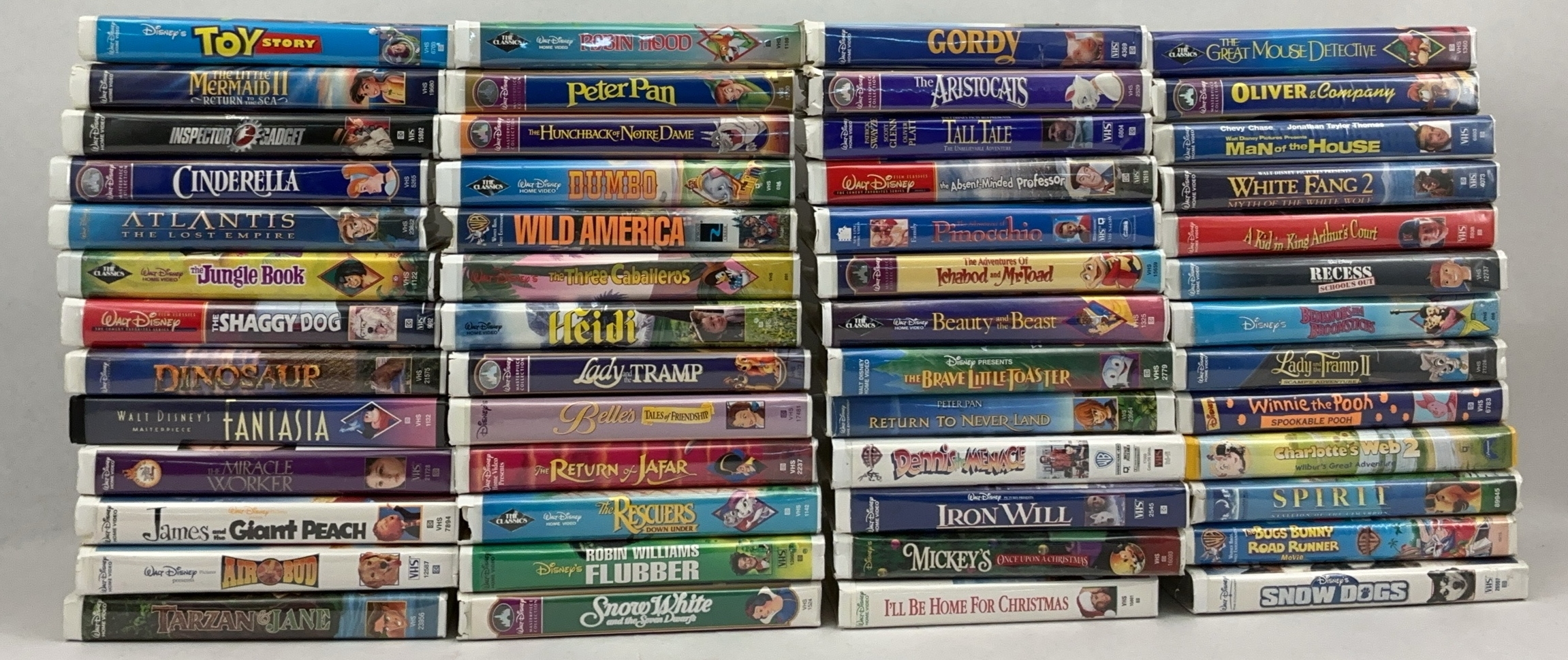Huge collection of Disney movies on VHS tape. Includes 52 classic titles as shown in the photos. Great for collectors or anyone looking to relive their childhood favorites! Used.