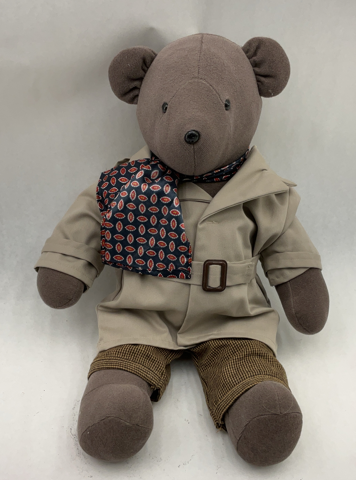 This is a vintage North American Bear Co. plush teddy bear. The bear is dressed in a coat, patterned scarf, and pants. It measures approximately 20x12.