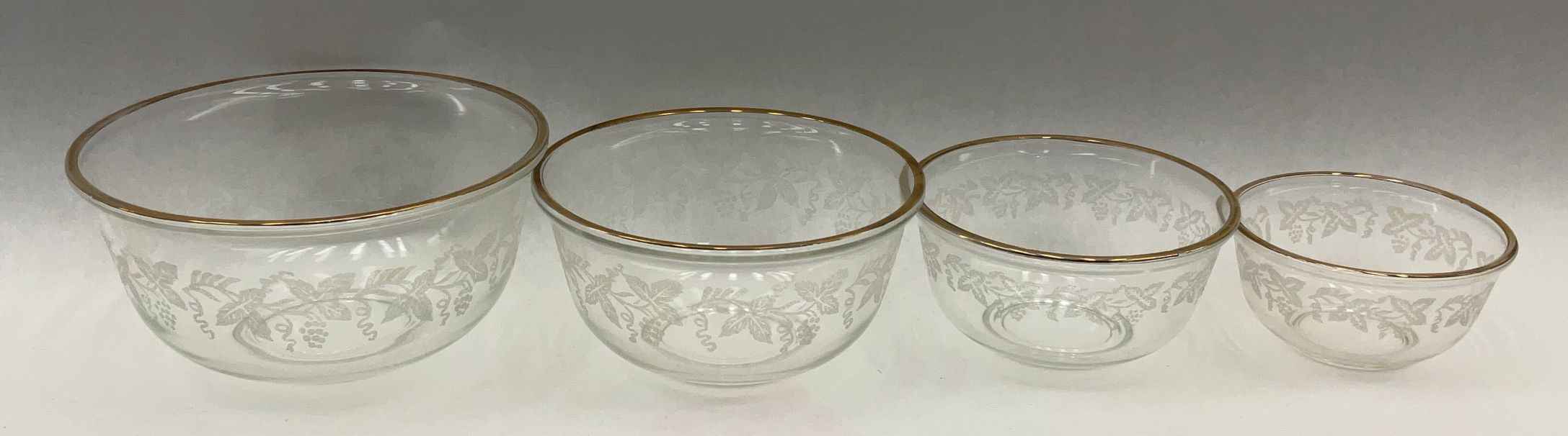 This listing is for a set of four etched glass bowls, each with a delicate gold trim. The largest bowl measures approximately 8 inches in diameter, while the smallest is around 5 inches.
