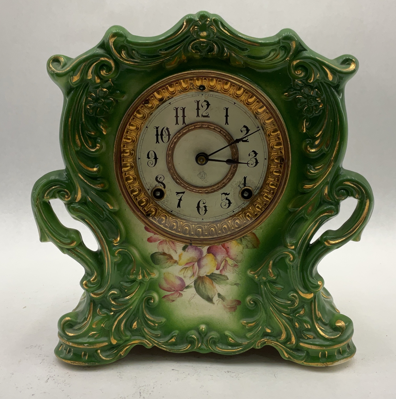 Green floral patterned Ansonia clock. Comes with key. 10x5x11