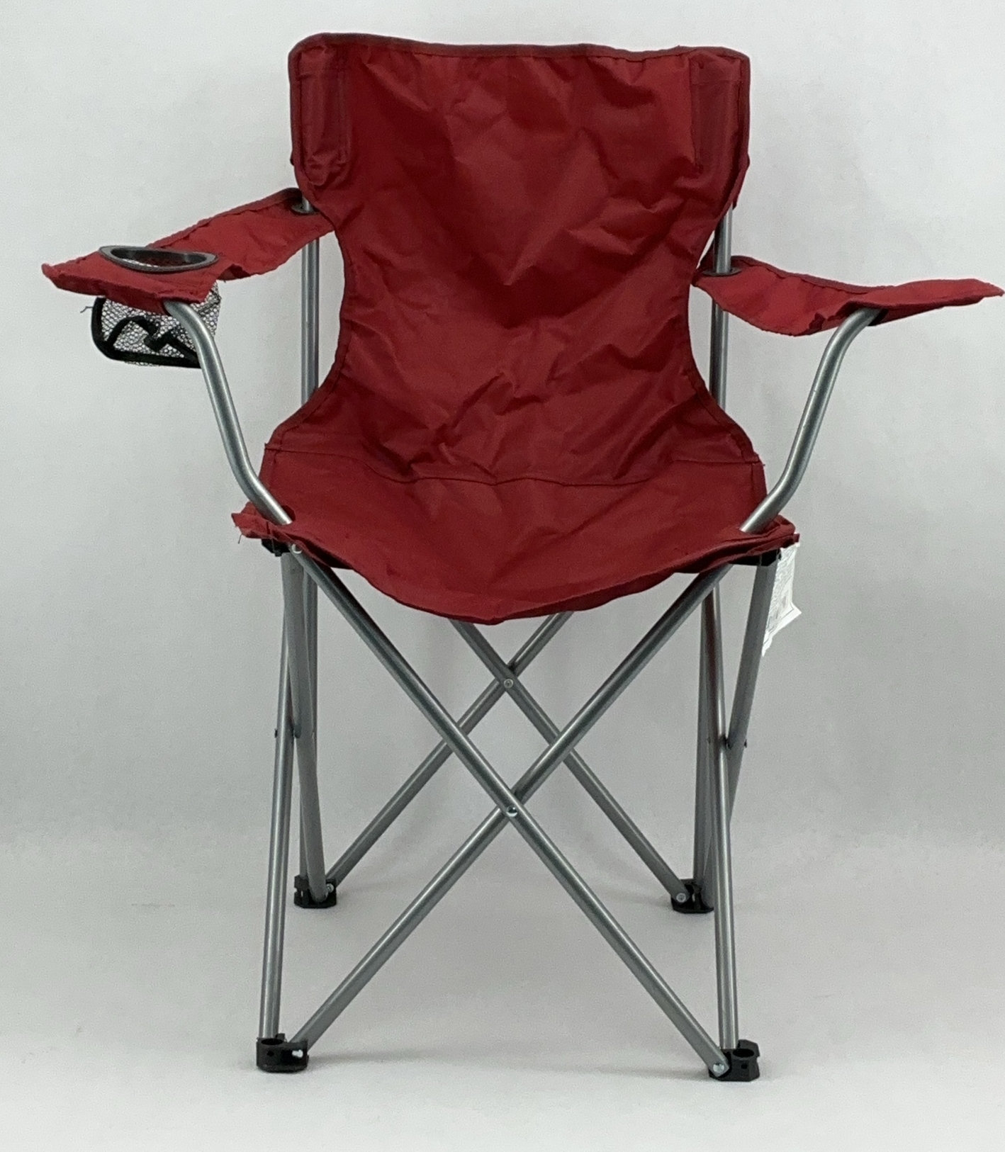 Red folding camp chair with armrests and a convenient cup holder. Measures 30” X 28” X 17”.