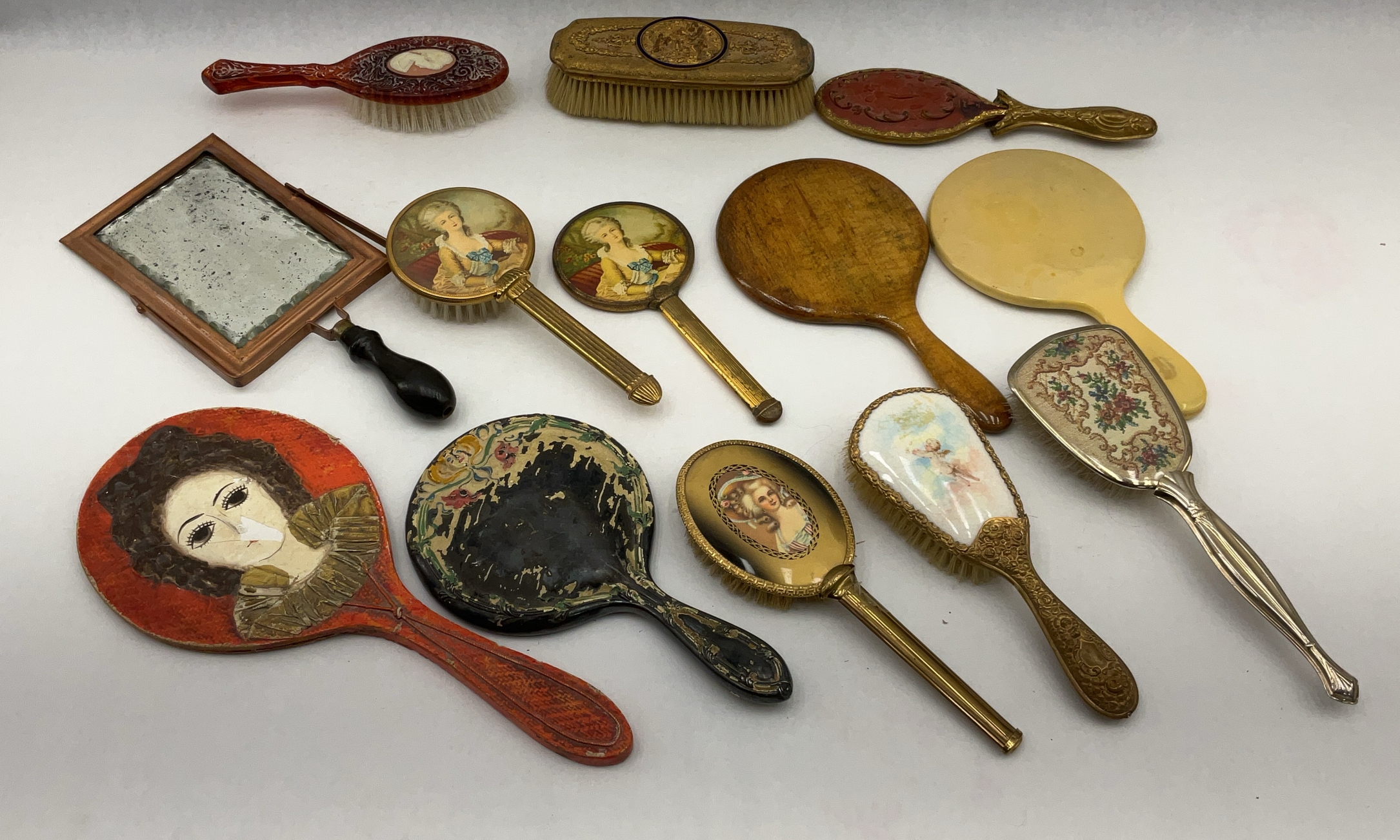 Collection of vintage vanity items includes hand mirrors with decorative handles and brush set. Assortment of shapes, sizes, and materials. Some mirrors contain portraits or scenes.