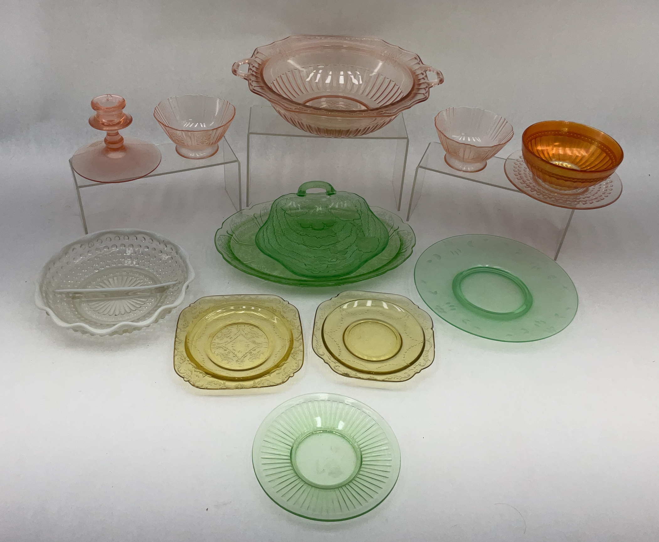 This lot features a variety of decorative glassware pieces in different colors and styles. The collection includes bowls, plates, and other serving pieces.