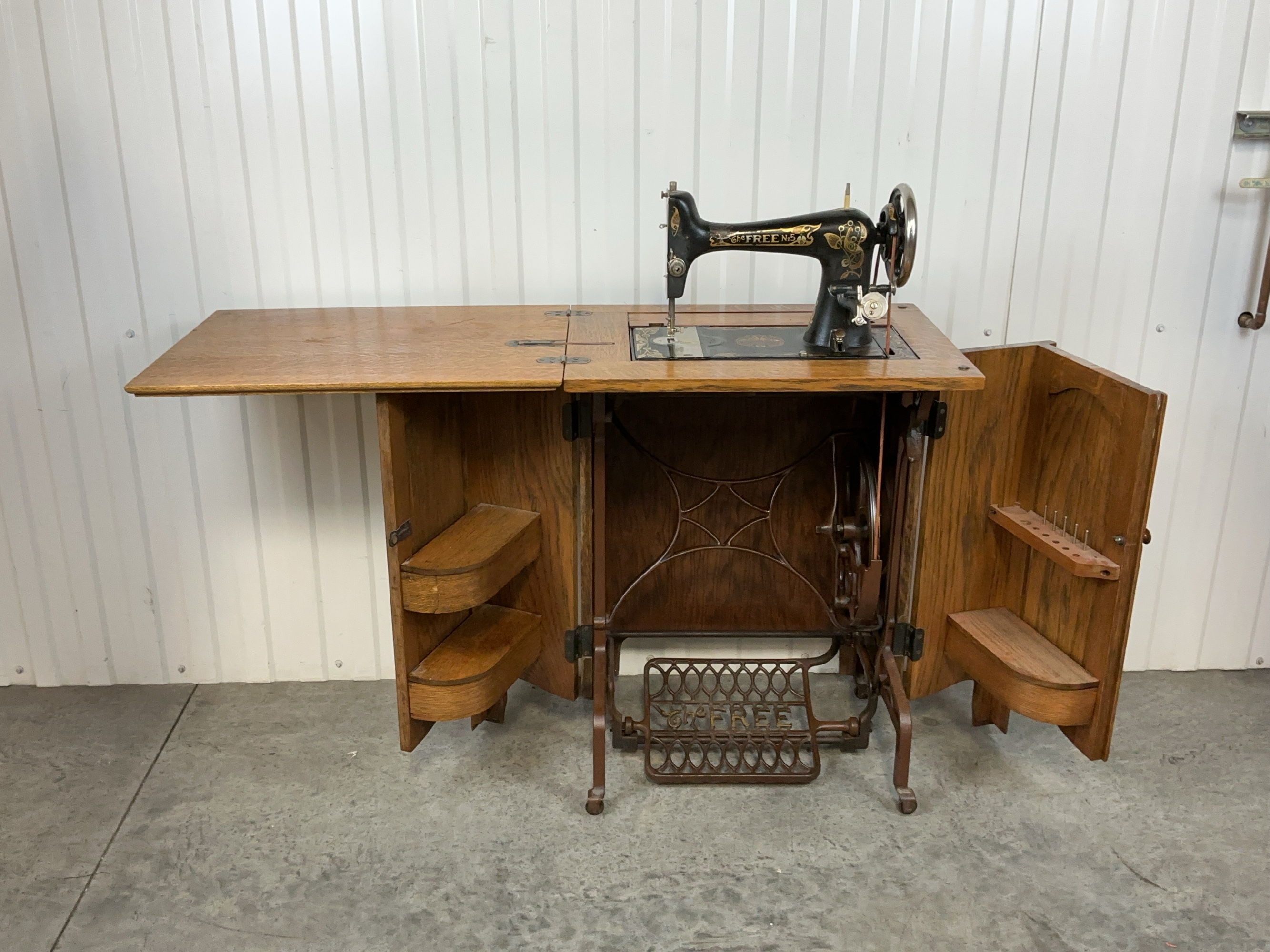 Antique Free Treadle Sewing Machine in Quarter Sawn Oak Cabinet