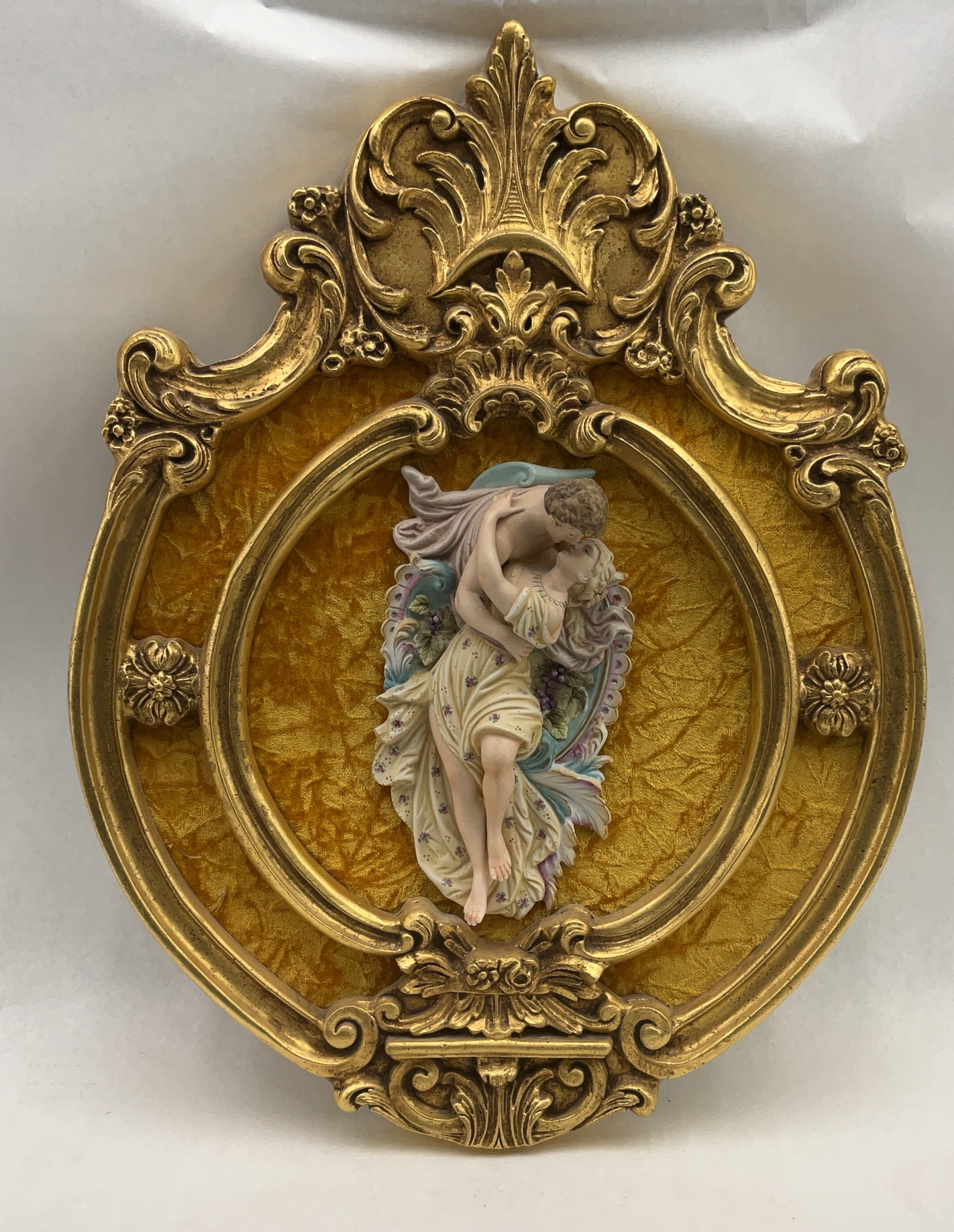 Framed figural wall hanging featuring a gold tone frame with decorative detailing and a central figure. Measures 25x30.