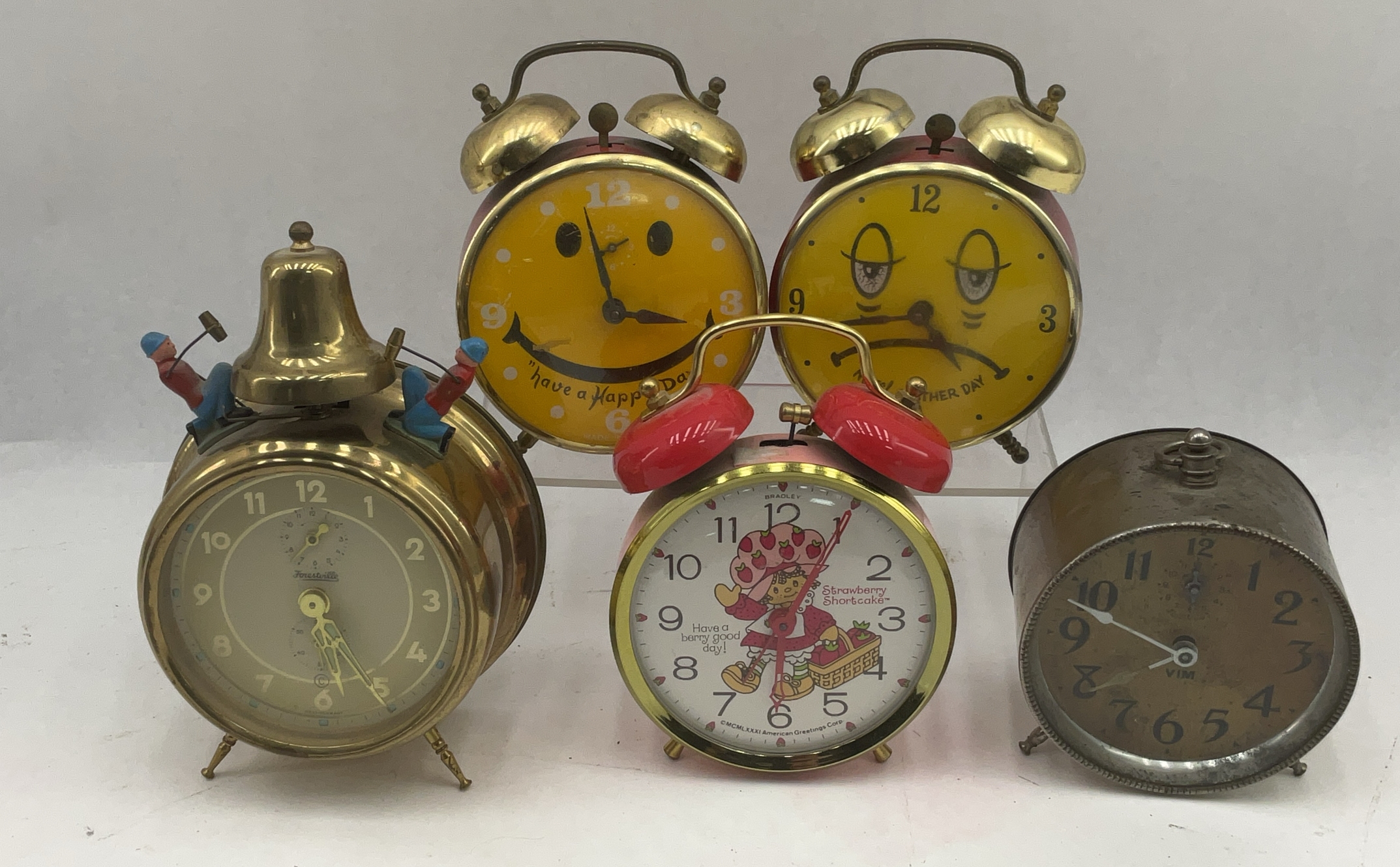 This lot includes five unique alarm clocks. One is made by Forestville Clock Co. of New York and Germany. There is a Strawberry Shortcake clock and two smiley face clocks. Also, included is a clock with figures of workers hitting the top bell and a clock with Arabic numerals.