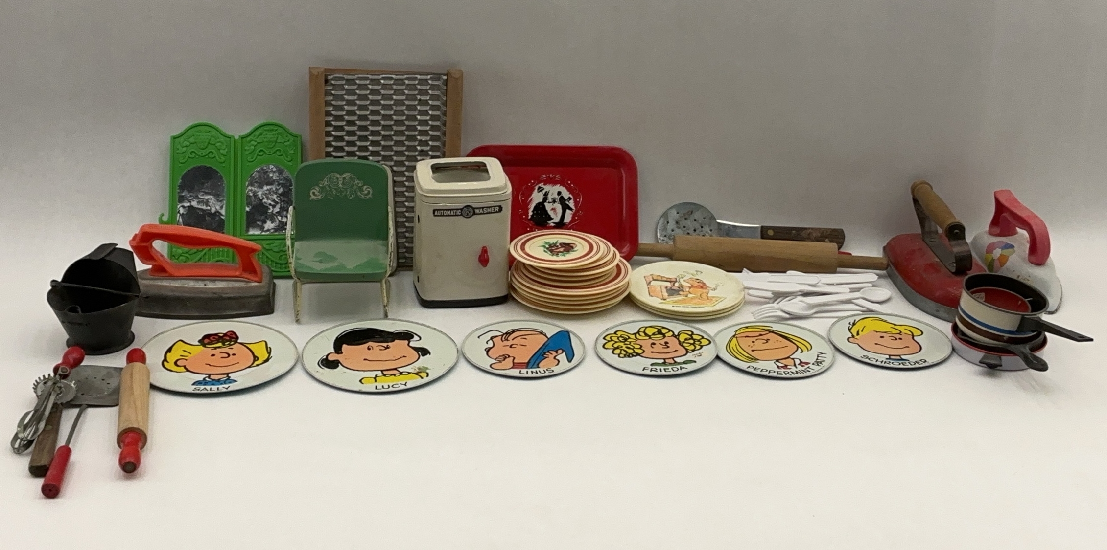 Used. Various miniature dishes and other decorations. Featuring miniature Peanuts character plates and various kitchenware. Vary in size from 2” to 8” in height.
