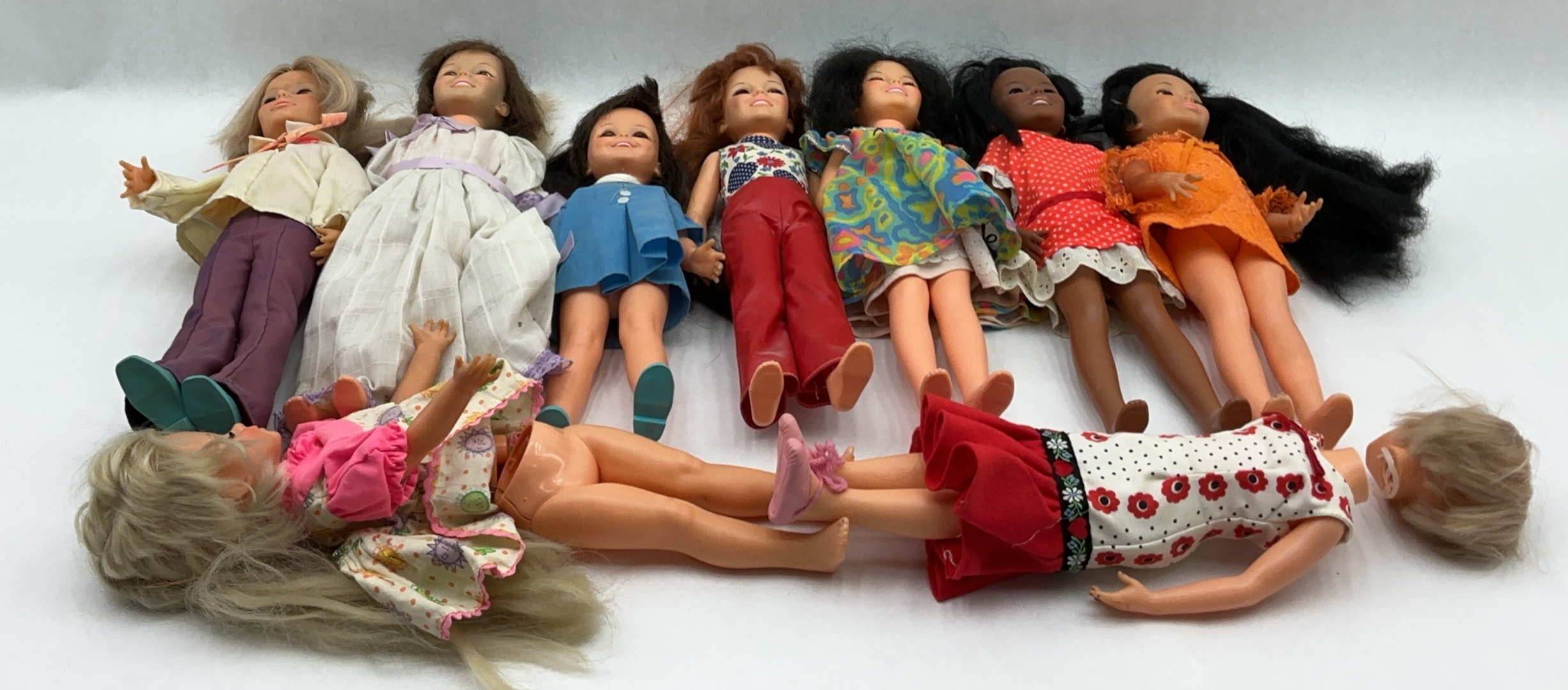 Used doll collection featuring 9 dolls, some with damage. Includes several dolls with maker's marks dating to 1971 from Ideal Toy Corp. Two dolls have significant damage and do not attach like necessary to function.