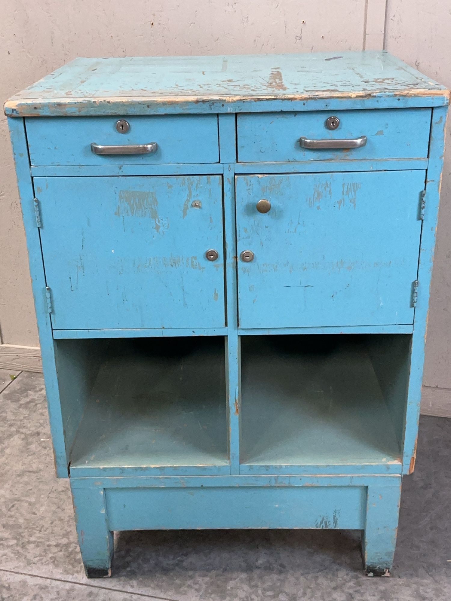 Turquoise painted cabinet featuring two drawers, cabinets with doors, and lower open compartments. Measures approximately 29 x 25 x 42.