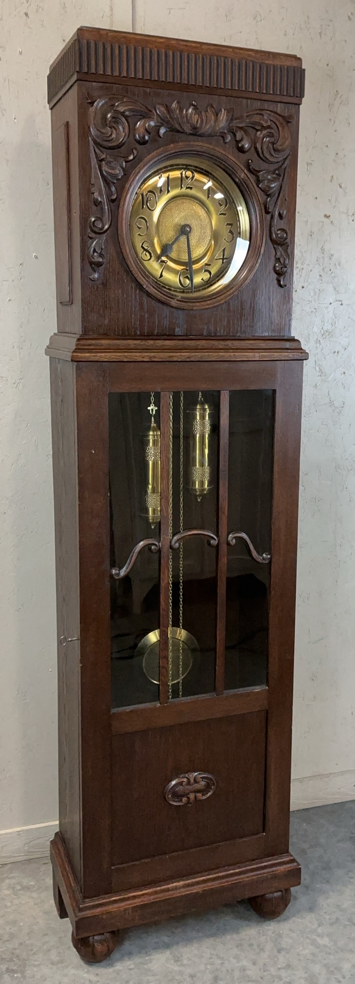 Dark wood Grandfather clock. Dimensions are approximately 21 x 12 x 76 inches. Includes the key.