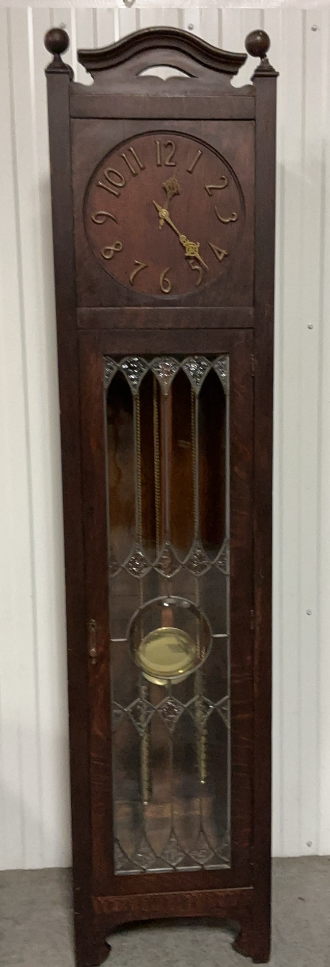 Up for auction is a dark wood grandfather clock featuring a leaded glass door. It stands approximately 81 inches tall and is 18 x 13 inches wide. The clock has a decorative face and includes weights and pendulum.