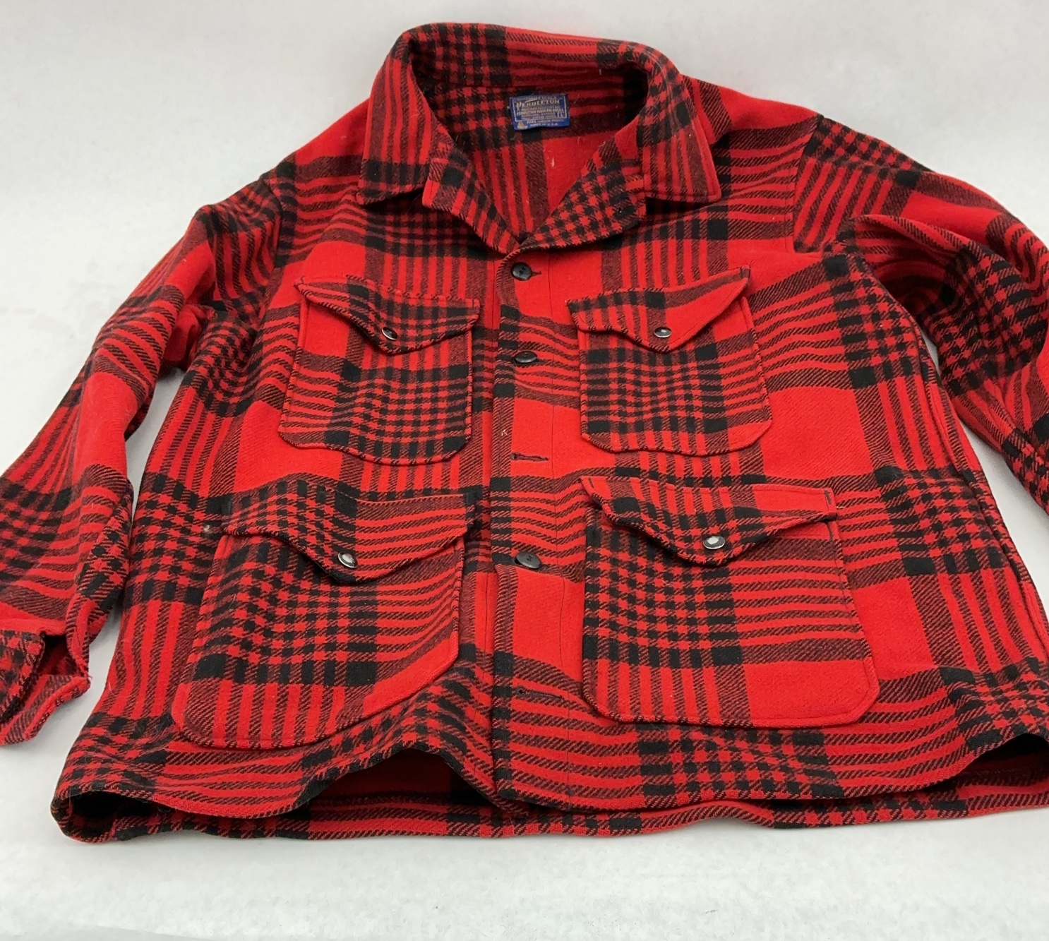 Pendleton size L missing one button on front and one on cuff. Red and black plaid pattern with multiple pockets.