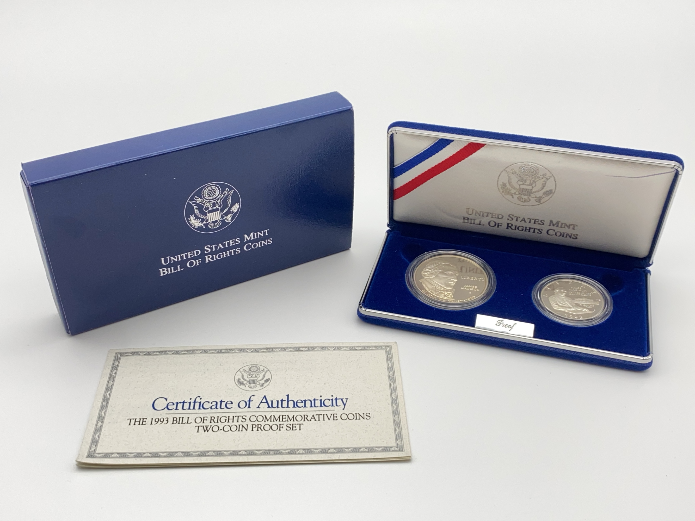 This listing features a 1993 Bill of Rights Commemorative Two-Coin Proof Set, includes a silver dollar coin and a silver half-dollar coin, accompanied by its Certificate of Authenticity.
