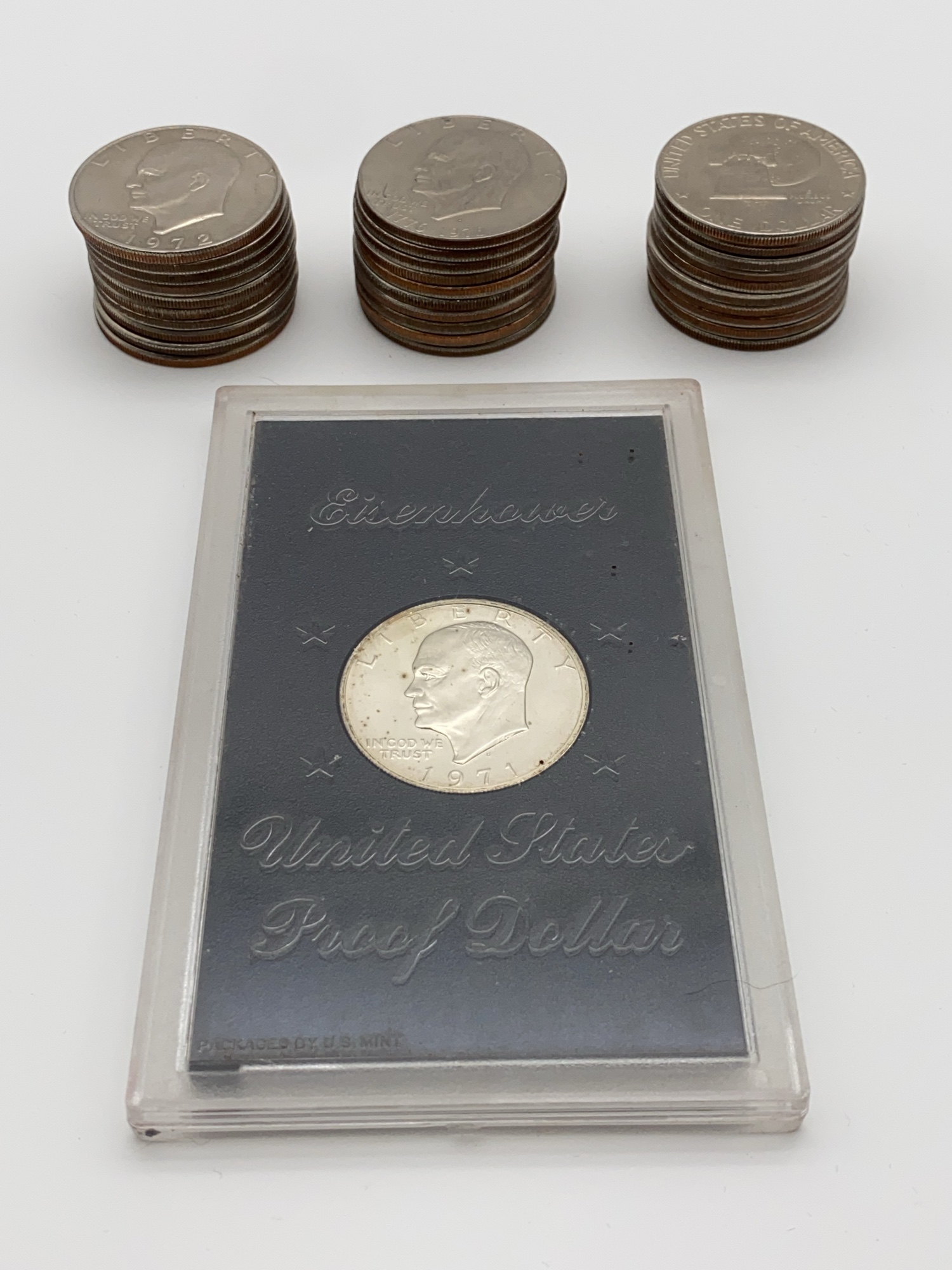 Group of Eisenhower dollar coins, totaling $31 in face value.