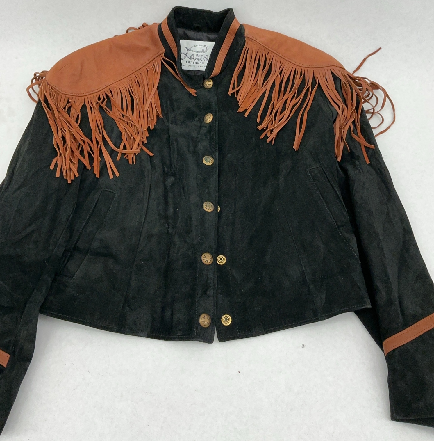 This auction is for a Lariat Leathers jacket. The jacket is black suede with fringe accents on the shoulders and sleeves. It has buttons. Made in the U.S.A.