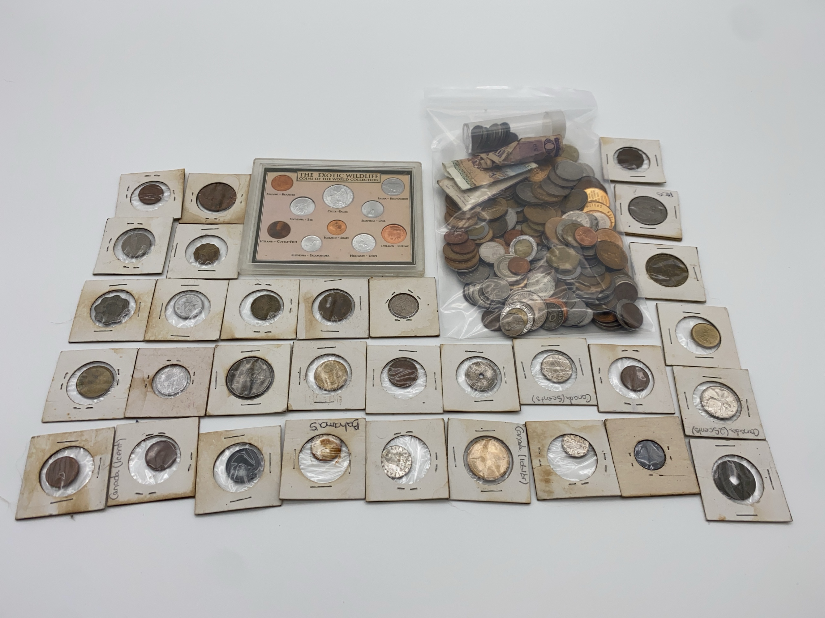 Collection includes a variety of world coins and paper currency from different countries. Also included are individual coins and sets.