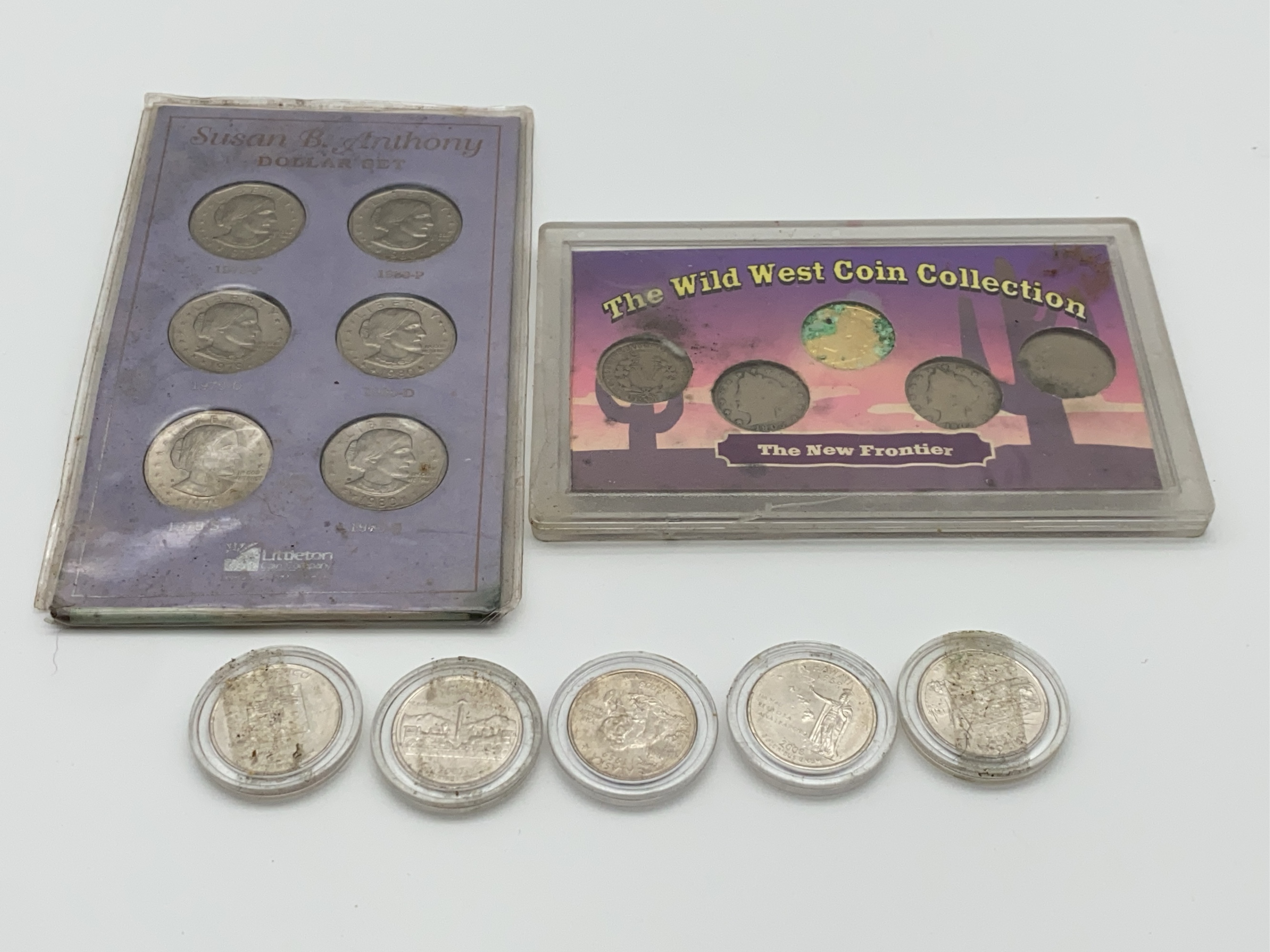 This lot features a Susan B. Anthony Dollar Set from Littleton Coin Company, including coins from 1979 and 1980. Additionally, there's a 'Wild West Coin Collection' set.