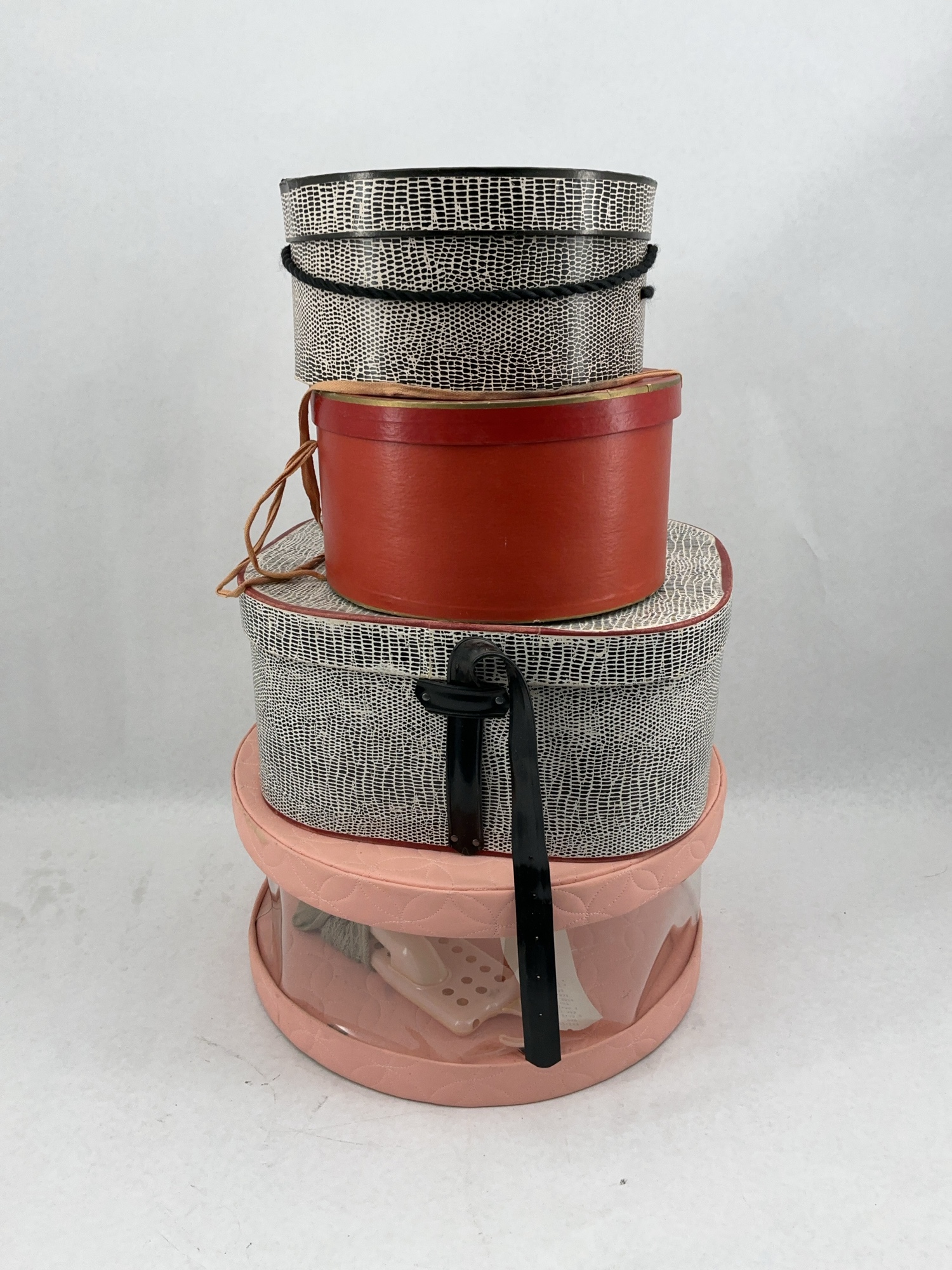 You are bidding on a set of four vintage hat boxes, including designs from Colby, Gage Originals, and others. These boxes would make a great display or storage solution.