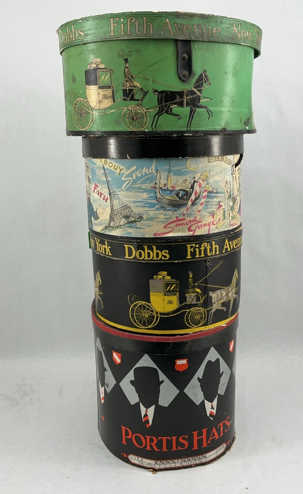 Four vintage hat boxes included in this lot. Boxes for Portis Hats, Dobbs Fifth Ave., and another with illustrations of Paris and Venice. These are great for decoration or storage.
