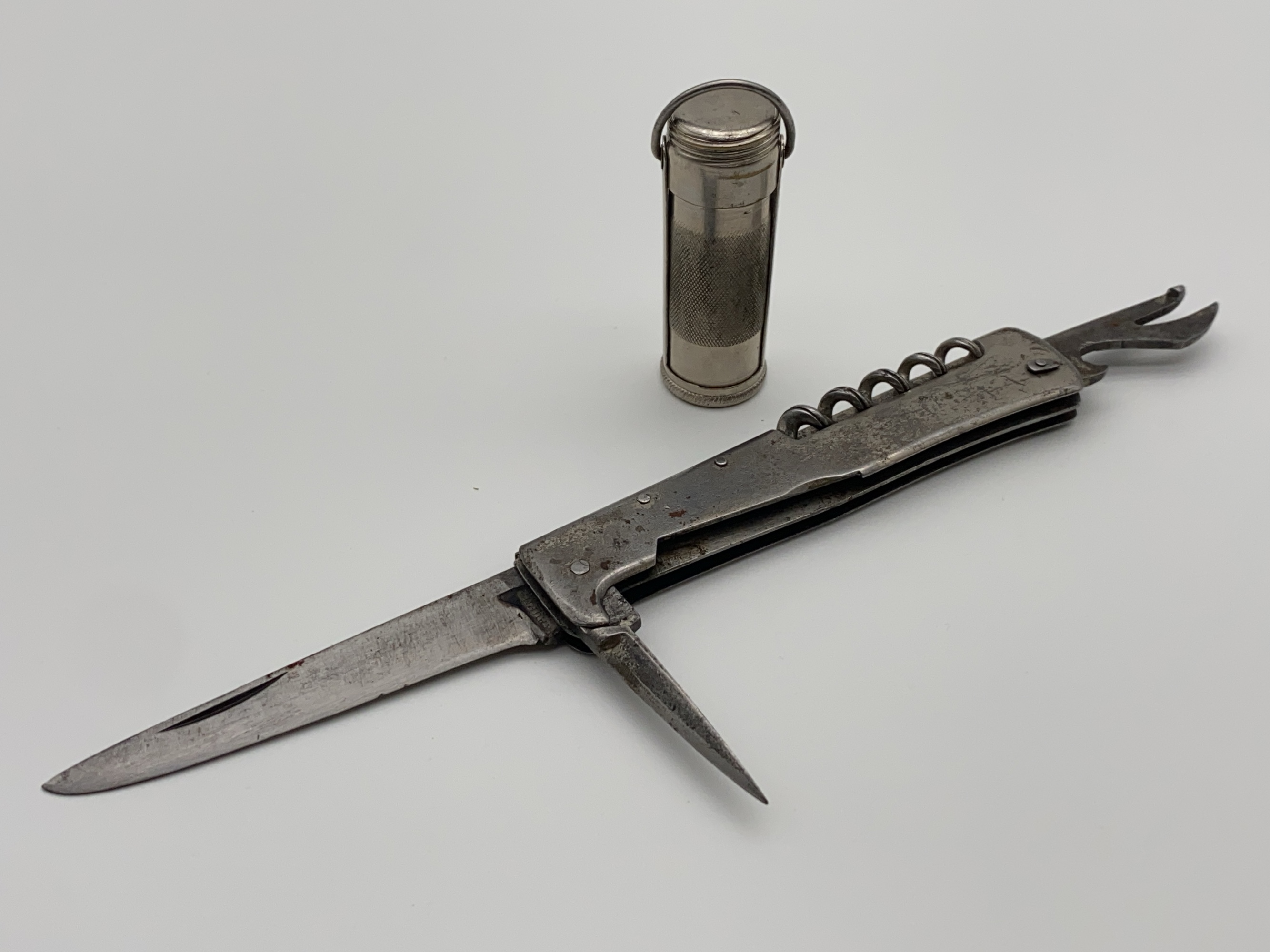 Multi-tool folding pocket knife marked "Mercator D.R.G.M" and "Solingen". Features a corkscrew, bottle opener, and can opener. Includes a protective cylinder case.