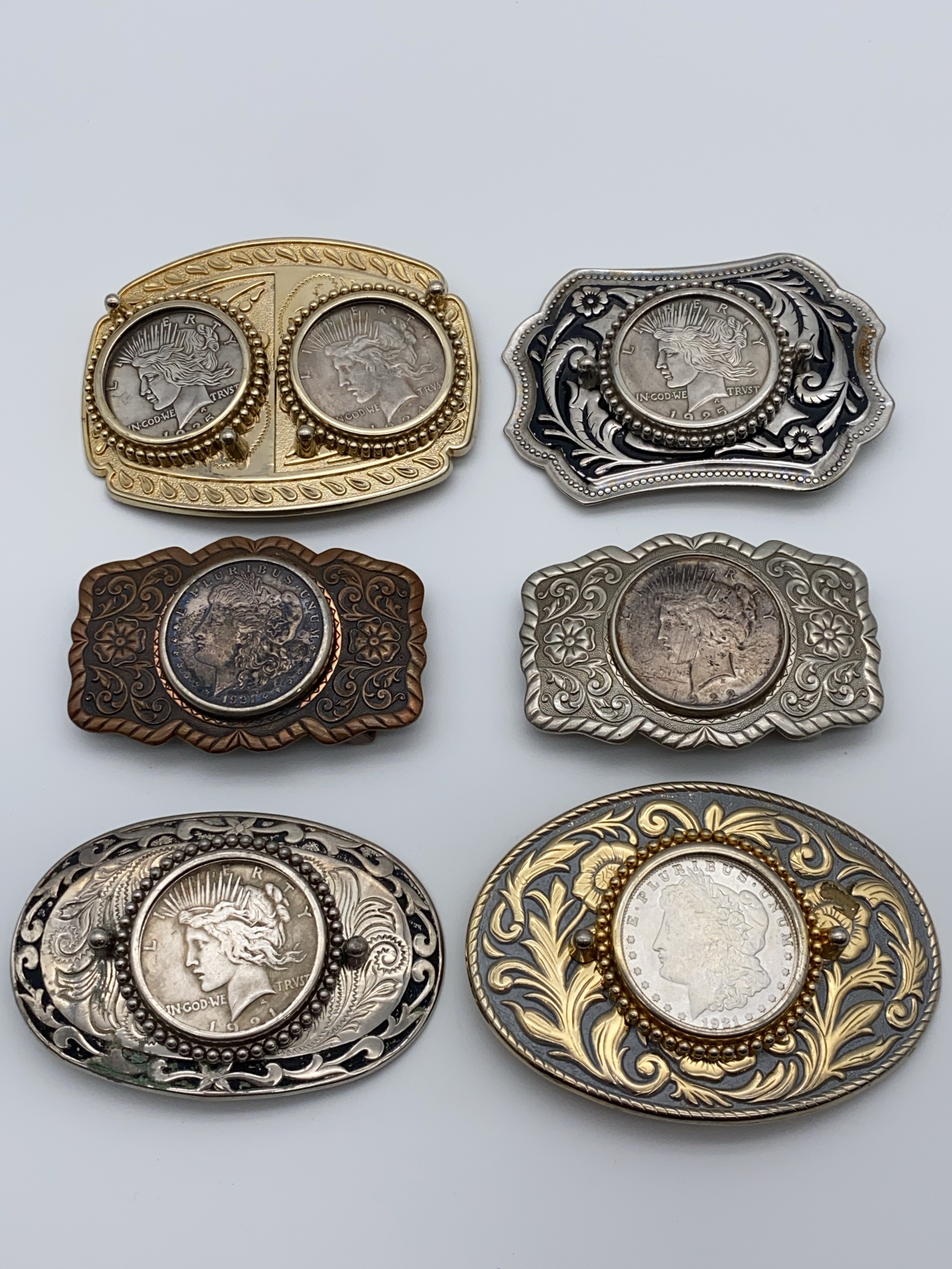 This auction includes a collection of belt buckles, each featuring an embedded silver dollar coin. The buckles have ornate designs and varied metallic finishes. The coins include Peace Dollars and Morgan Dollars. Great for collectors of Western wear or coin enthusiasts.