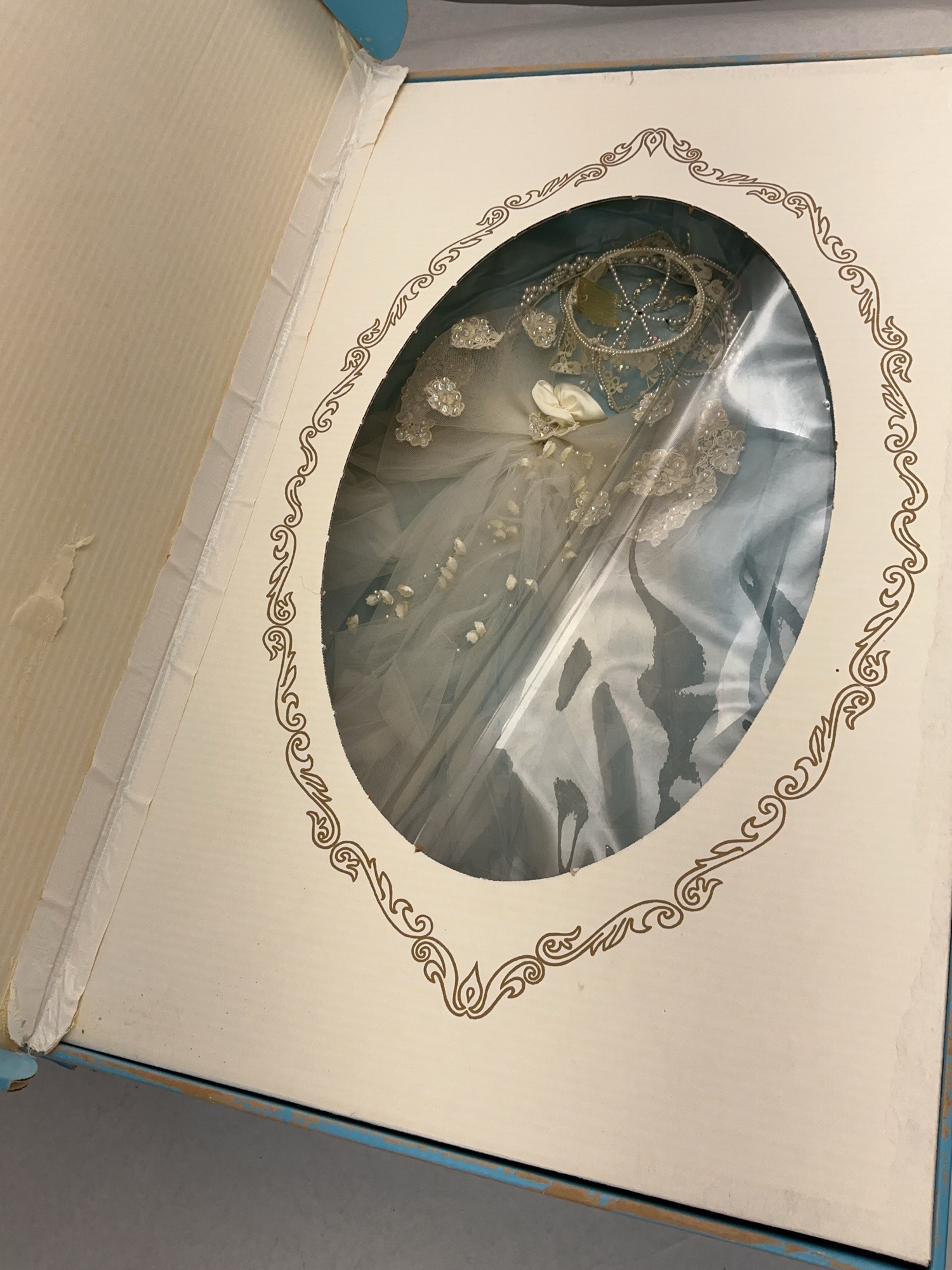 Set includes a vintage wedding gown, veil with floral details, and a little girl's dress. The wedding gown is displayed in its original box and the waist measures 32 inches. The child’s dress has yellowing.