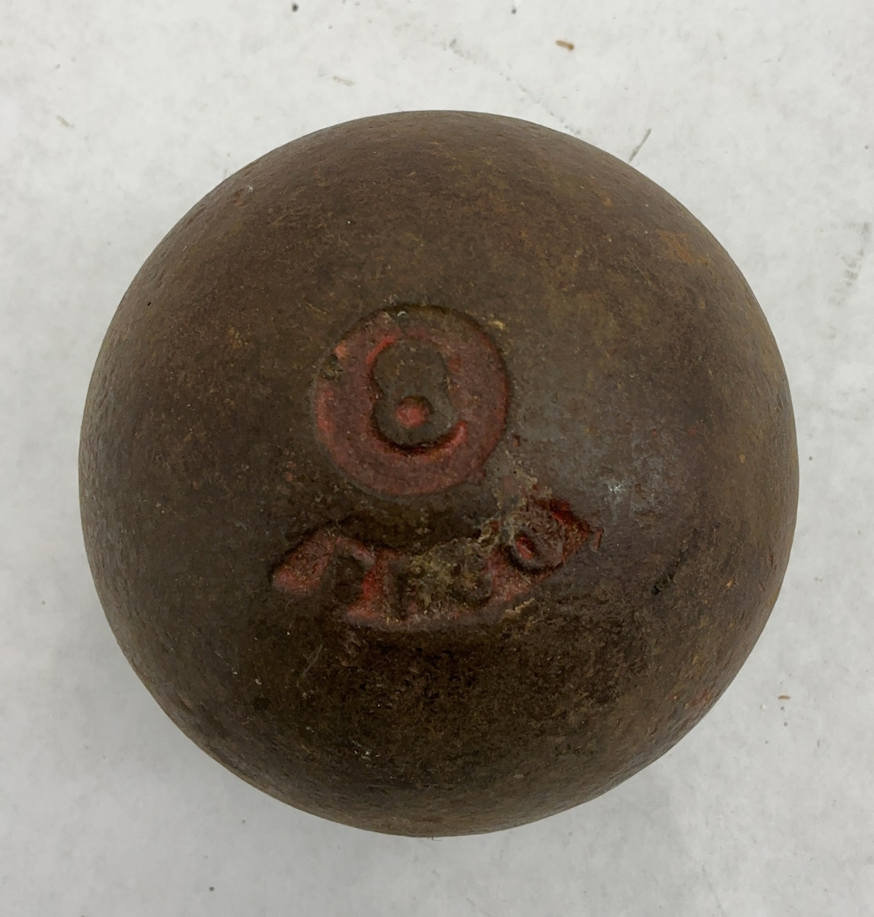 Original cannon ball, weighing 8 pounds. Origin unknown.