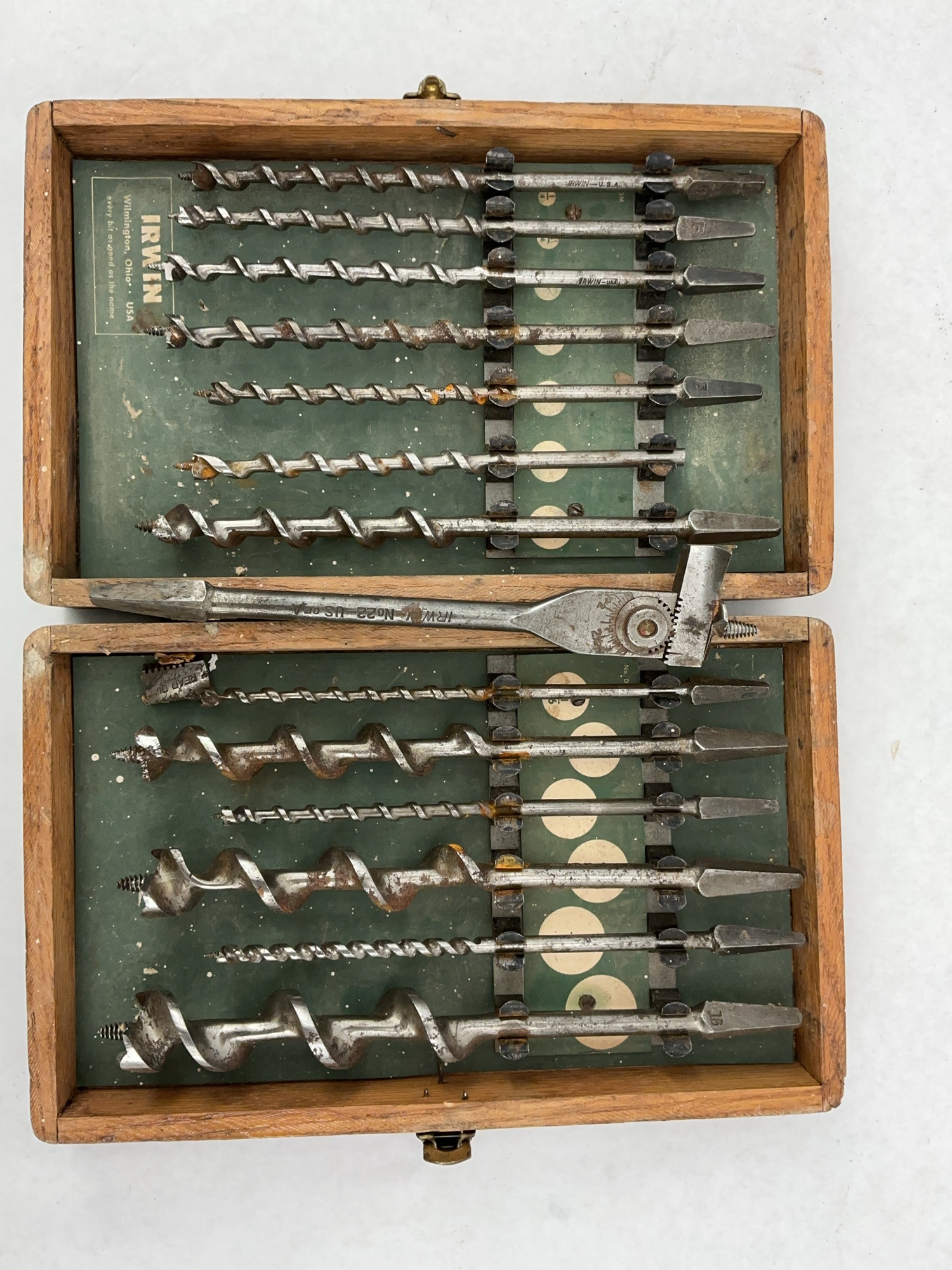 Set of Irwin auger bits in wooden storage box. Includes a variety of sizes.