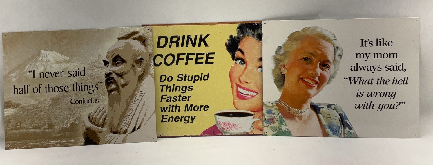 Set of 3 Metal Novelty Signs - Confucius, Coffee, and Mom Quotes