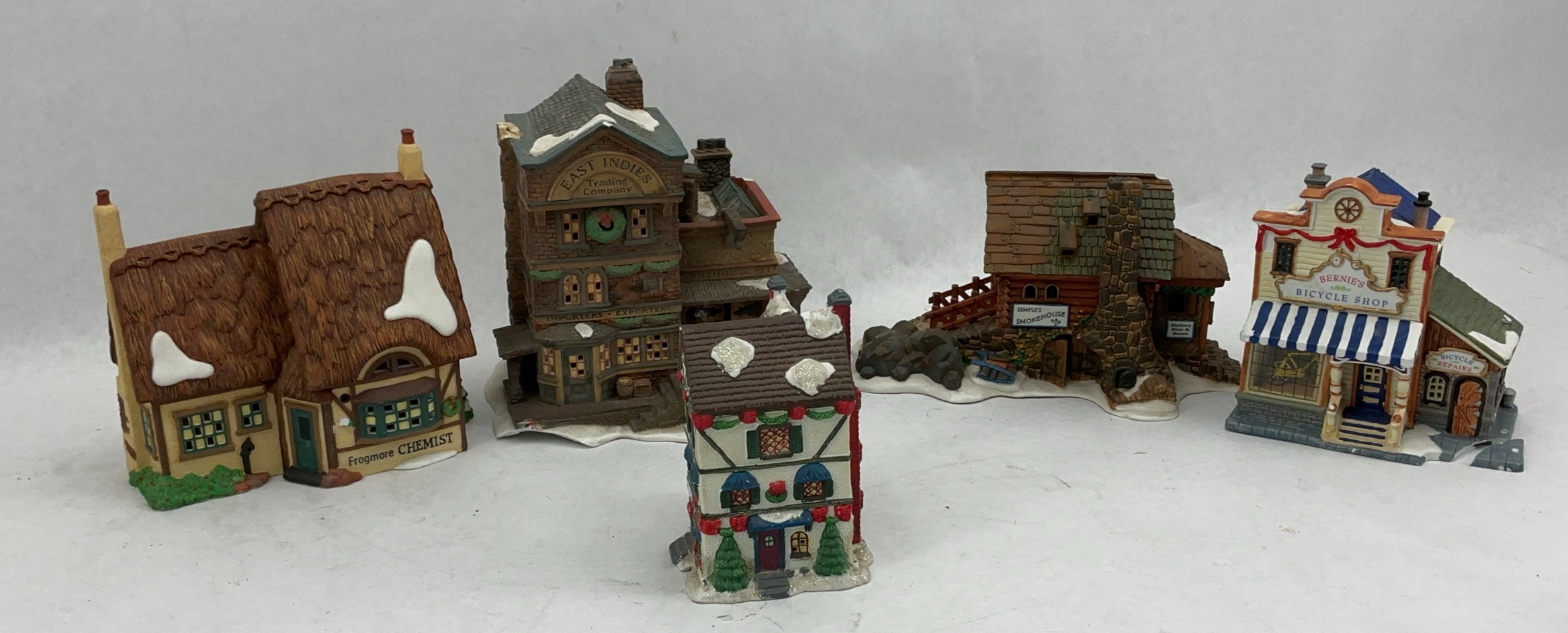 Various lot including Lemax, Dept 56, and Trina home Village collection pieces. Includes a brick look mat for the Village collection. Also includes light cords, untested.