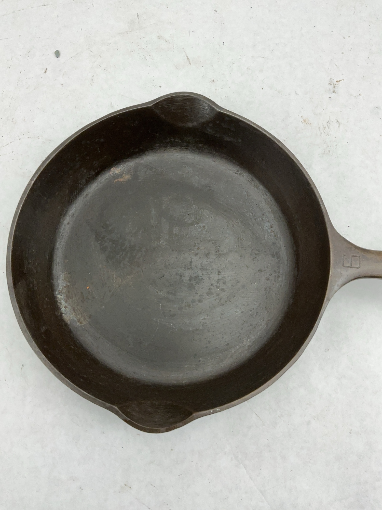 Cast iron skillet, Griswold No. 6. Measures 9 inches across. Sits flat.