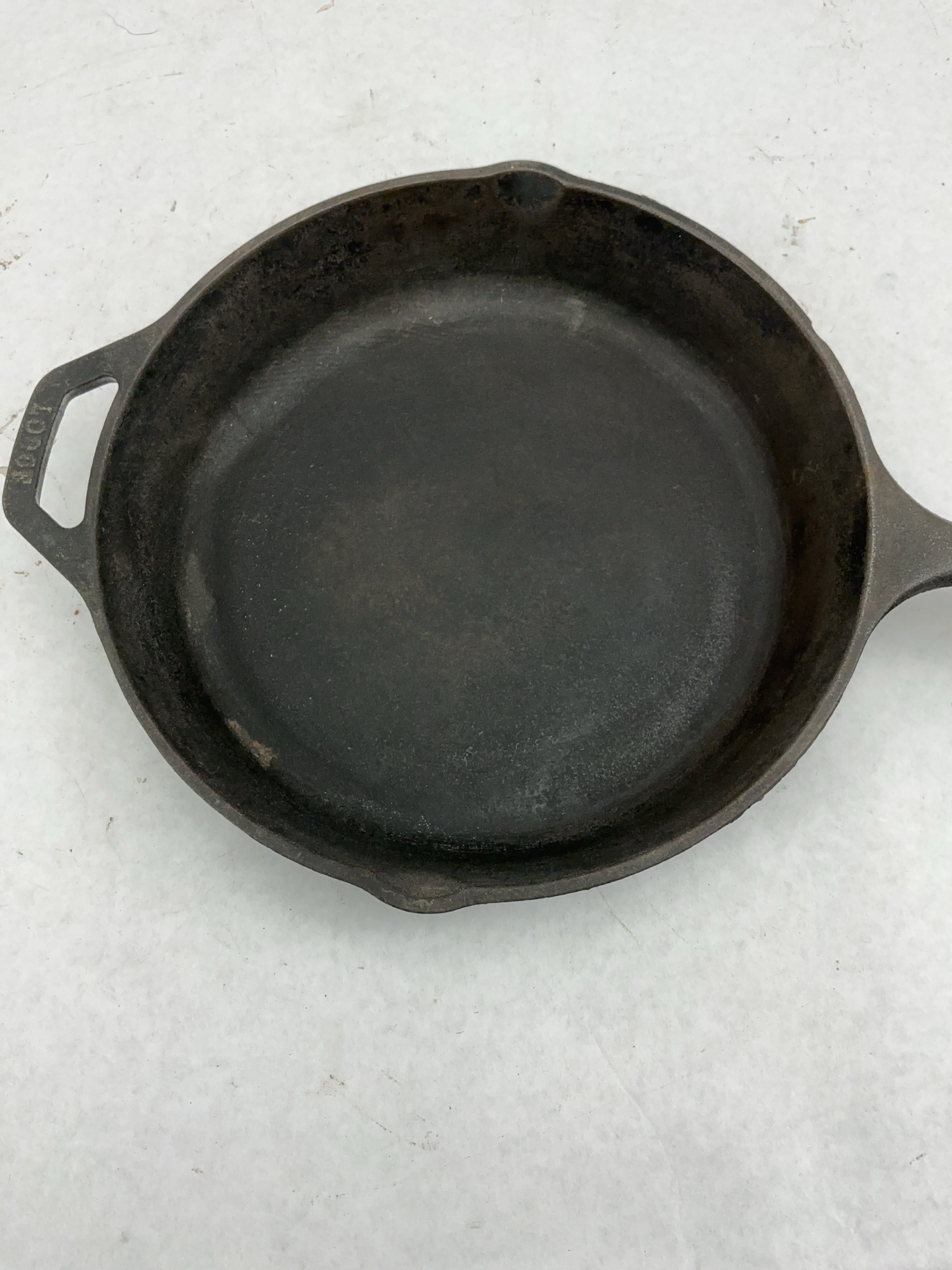 Lodge cast iron skillet. Measures 10.5 inches. Sits flat. Features a deer design on the back. There is a small chip on the edge.