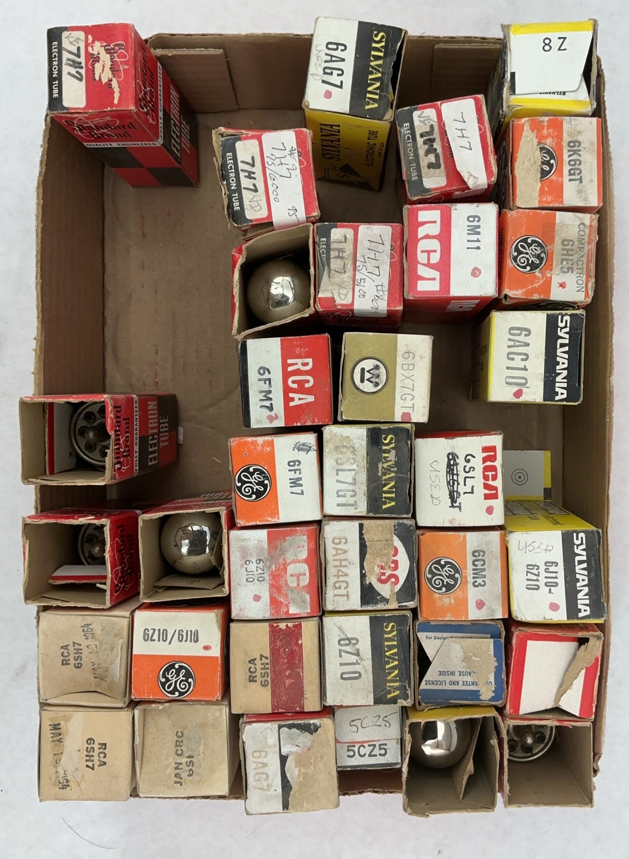 Box of assorted Electron tubes. Total of 35. Includes tubes from RCA, Sylvania, and GE. Untested.