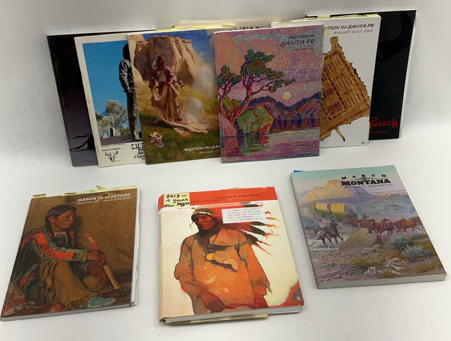 You are bidding on a collection of catalogs and books featuring the works of C.M. Russell. This lot includes catalogs from various auctions in Santa Fe and Montana, along with some publications focused on Russell's art and the Western Masters Art Show & Sale.