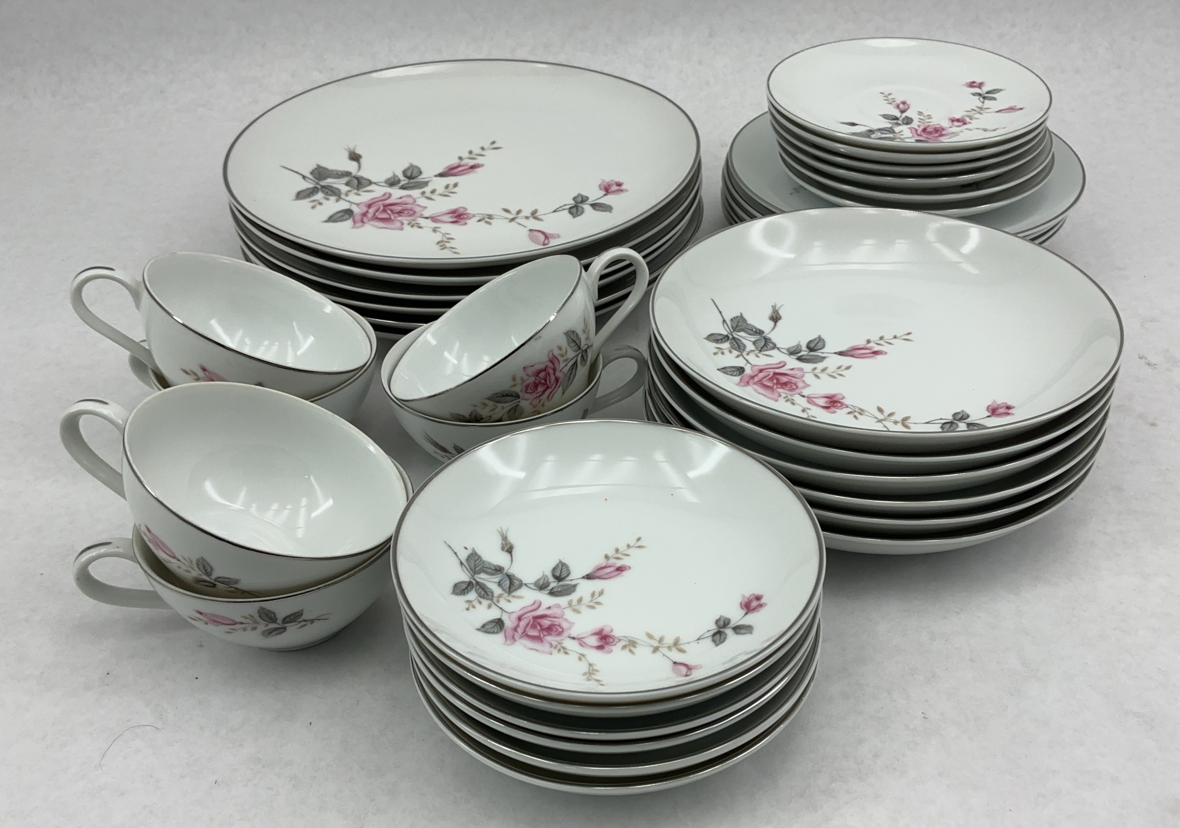 Setting for six. Castlecourt Rose Glow Japan. Six of each-dinner plates, salad plates, side plates, soup bowls, cups and saucers.